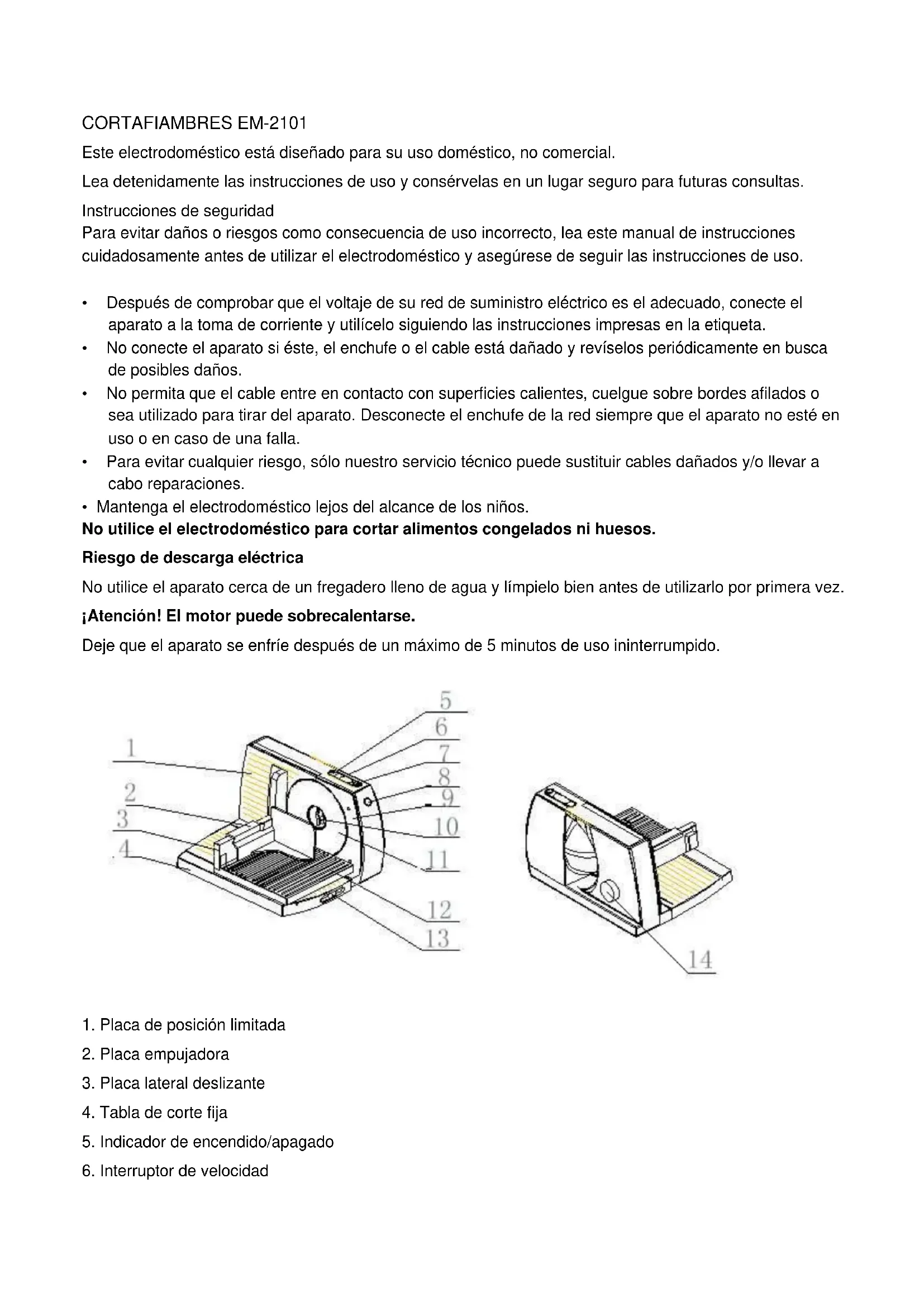Descripción general: Nombre del producto : corta-fiambres Modelo: HC3001/EM-2101 Datos técnicos: 230V~, 50Hz, 120W Cuchilla de acero inoxidable de 170 mm. de diámetro. Espesor de corte: <1.5 cm. Instrucciones de uso Coloque el electrodoméstico sobre una superficie lisa, abra la base y pulse el botón de bloqueo (13). Monte el carro deslizante, inserte la placa lateral deslizante (3) en posición vertical en la guía lateral y colóquelo en la base. Una la placa empujadora (2) a la placa lateral deslizante (3). Ajuste el espesor del corte utilizando el botón (14). Uso momentáneo: Pulse el botón de seguridad Ajuste el interruptor de velocidad para obtener la velocidad de giro deseada. Pulse el botón de seguridad, después pulse el interruptor de ENCENDIDO/APAGADO hasta que el electrodoméstico se ponga en marcha. Para interrumpir la marcha del electrodoméstico, pulse el botón de seguridad y libere el interruptor de ENCENDIDO/APAGADO. Precaución: No ajuste el interruptor móvil cuando el electrodoméstico esté en marcha. Riesgo de lesión por cuchilla afilada: - La cuchilla continúa en movimiento segundos después de haber apagado el electrodoméstico. - Nunca ponga las manos cerca de la cuchilla. Control de velocidad Controla la velocidad del corte. Si el alimento es muy blando (p. ej. queso), fije la velocidad en MIN. Utilice siempre el carro deslizante y el recipiente para residuos. No quite el carro deslizante ni el recipiente de residuos a menos que el tamaño y la forma del alimento que va a cortar impida el uso del carro deslizante y el recipiente de residuos.Consejo: Corte las salchichas y el queso primero y el pan en último lugar; de este modo será más fácil limpiar el electrodoméstico. Tras limpiar el electrodoméstico después de usarlo, extraiga la mesa y cierre el electrodoméstico. Enrolle el cable y encaje el enchufe en su sitio. Mantenga el aparato fuera del alcance de los niños; la cuchilla afilada puede ocasionar heridas. Saque el enchufe y la cuchilla antes de limpiarlo. Toque sólo el botón fijo. Nunca toque el borde de la cuchilla. ¡Atención! Las superficies pueden resultar dañadas. No utilice detergentes agresivos; limpie el aparato y los accesorios con un paño húmedo y déjelos secar. Tenga cuidado al limpiar la cuchilla circular, ya que está muy afilada. Limpie la cuchilla circular inmediatamente después de cada uso y siempre a mano. Gire el porta-cuchilla en dirección contraria a las manecillas del reloj, póngalo en posición vertical y extraiga la cuchilla circular. Si la cuchilla está muy sucia, puede quitar la cubierta de la cuchilla, comenzando en el borde exterior. Cuando vuelva a colocar la cuchilla, asegúrese de que esté bien colocada correctamente en su sitio, con el botón fijo en posición horizontal. Existe riesgo de lesión por caída de la cuchilla Garantía Las condiciones de la garantía de este electrodoméstico están reguladas por nuestro representante en el país de venta. Para conocer los detalles de estas condiciones, consulte al vendedor del comercio donde adquirió el electrodoméstico. Debe presentarse el recibo de compra o la factura al realizar cualquier reclamación bajo los términos de esta garantía.AFFETTATRICE EM-2101 Questo è un apparecchio per uso domestico, non inteso per l’uso commerciale. Leggere queste istruzioni per usarlo in sicurezza e conservarle in un posto sicuro per delle consultazioni in futuro. Istruzioni di sicurezza. Per evitare danni oppure pericoli causati da un uso non corretto, leggere questo manuale d’uso prima di usare l’apparecchio, assicurarsi di seguire le istruzioni.