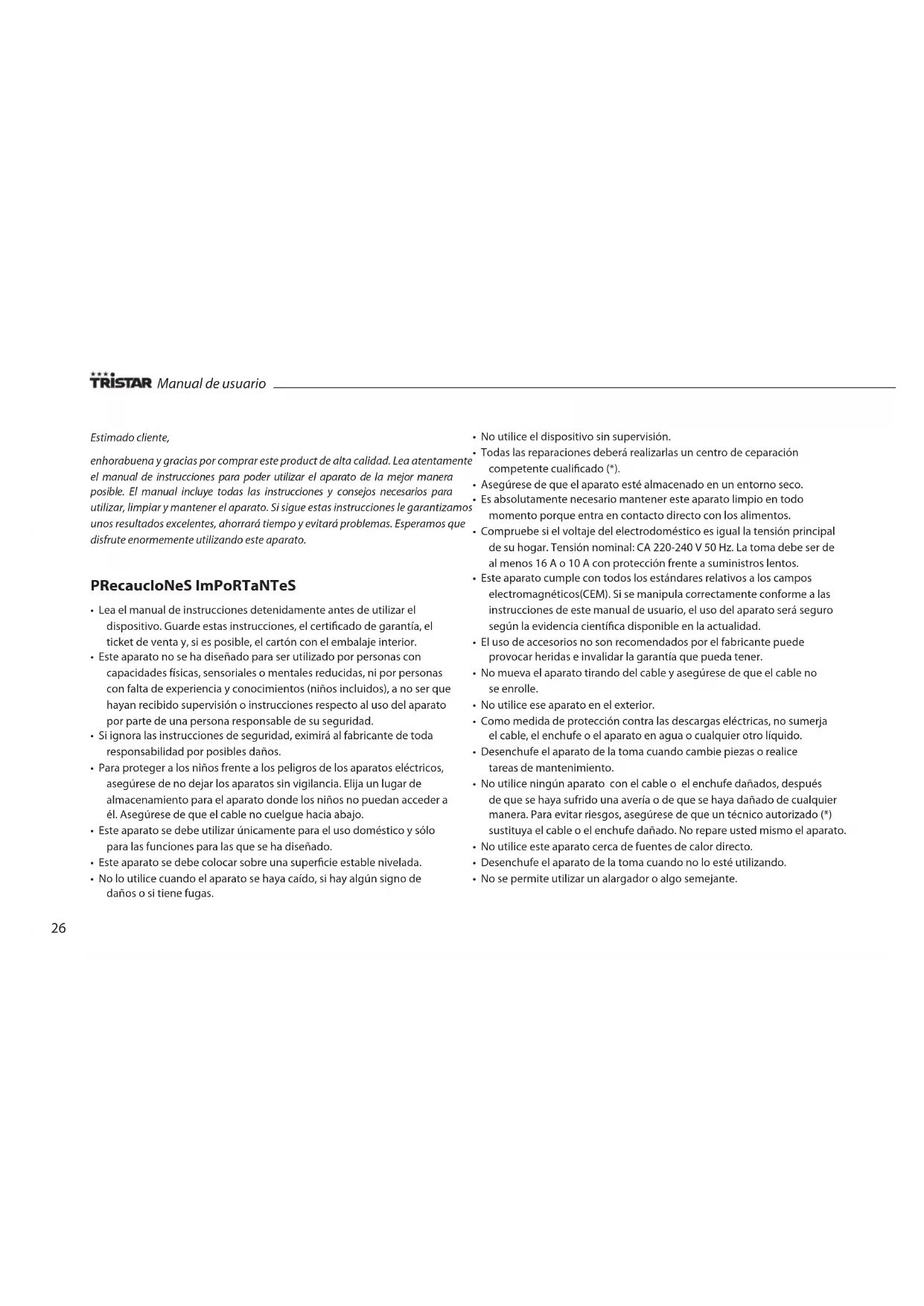 - Tristar no será responsable de los daños materiales o lesiones personales causados por un uso incorrecto o si no se respetan las instrucciones de seguridad.