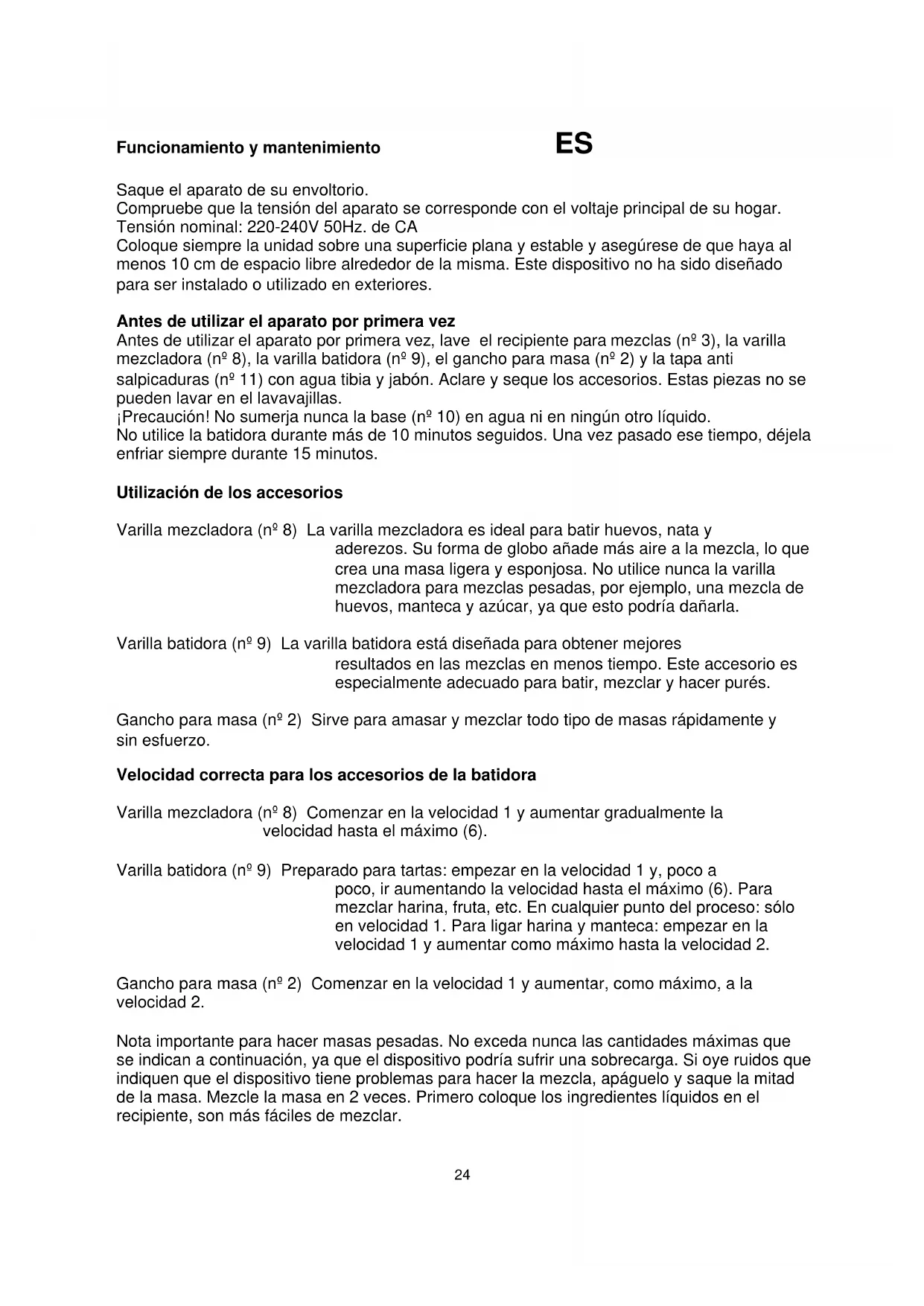 Verpackung Die Verpackungsmaterialien sind 100% recyclingfähig. Produkt Dieses Gerät entspricht der europäischen Richtlinie 2002/96/EC für elektrische und elektronische Altgeräte (EAG). Durch korrekte Wiederverwertung helfen Sie beim Schutz unserer Umwelt. EU Konformitätserklärung Dieses Gerät wurde entsprechend der Niederspannungsrichtlinie 2006/95/EC und der EMC- Richtlinie 2004/108/EC sowie der Richtlinie 93/68/EEC gefertigt und vermarktet.24 Funcionamiento y mantenimiento ES Saque el aparato de su envoltorio. Compruebe que la tensión del aparato se corresponde con el voltaje principal de su hogar. Tensión nominal: 220-240V 50Hz. de CA Coloque siempre la unidad sobre una superficie plana y estable y asegúrese de que haya al menos 10 cm de espacio libre alrededor de la misma. Este dispositivo no ha sido diseñado para ser instalado o utilizado en exteriores. Antes de utilizar el aparato por primera vez Antes de utilizar el aparato por primera vez, lave el recipiente para mezclas (nº 3), la varilla mezcladora (nº 8), la varilla batidora (nº 9), el gancho para masa (nº 2) y la tapa anti salpicaduras (nº 11) con agua tibia y jabón. Aclare y seque los accesorios. Estas piezas no se pueden lavar en el lavavajillas. ¡Precaución! No sumerja nunca la base (nº 10) en agua ni en ningún otro líquido. No utilice la batidora durante más de 10 minutos seguidos. Una vez pasado ese tiempo, déjela enfriar siempre durante 15 minutos. Utilización de los accesorios Varilla mezcladora (nº 8) La varilla mezcladora es ideal para batir huevos, nata y aderezos. Su forma de globo añade más aire a la mezcla, lo que crea una masa ligera y esponjosa. No utilice nunca la varilla mezcladora para mezclas pesadas, por ejemplo, una mezcla de huevos, manteca y azúcar, ya que esto podría dañarla. Varilla batidora (nº 9) La varilla batidora está diseñada para obtener mejores resultados en las mezclas en menos tiempo. Este accesorio es especialmente adecuado para batir, mezclar y hacer purés. Gancho para masa (nº 2) Sirve para amasar y mezclar todo tipo de masas rápidamente y sin esfuerzo. Velocidad correcta para los accesorios de la batidora Varilla mezcladora (nº 8) Comenzar en la velocidad 1 y aumentar gradualmente la velocidad hasta el máximo (6). Varilla batidora (nº 9) Preparado para tartas: empezar en la velocidad 1 y, poco a poco, ir aumentando la velocidad hasta el máximo (6). Para mezclar harina, fruta, etc. En cualquier punto del proceso: sólo en velocidad 1. Para ligar harina y manteca: empezar en la velocidad 1 y aumentar como máximo hasta la velocidad 2. Gancho para masa (nº 2) Comenzar en la velocidad 1 y aumentar, como máximo, a la velocidad 2. Nota importante para hacer masas pesadas. No exceda nunca las cantidades máximas que se indican a continuación, ya que el dispositivo podría sufrir una sobrecarga. Si oye ruidos que indiquen que el dispositivo tiene problemas para hacer la mezcla, apáguelo y saque la mitad de la masa. Mezcle la masa en 2 veces. Primero coloque los ingredientes líquidos en el recipiente, son más fáciles de mezclar.25 Cantidades máximas Masa para crumble y masa con levadura dura: 2.0 kg. Masa con levadura suave: 2,5 kg. Mezcla para tarta: 2.7 kg. Utilización Gire el botón de desbloqueo (nº 5) hacia abajo para elevar el brazo articulado (nº 4). Consulte las Figuras 1 y 2. Coloque el recipiente para mezclas (nº 2) sobre la base y gírelo en el sentido contrario a las agujas del reloj para encajarlo, tal y como se muestra en la Figura 3.