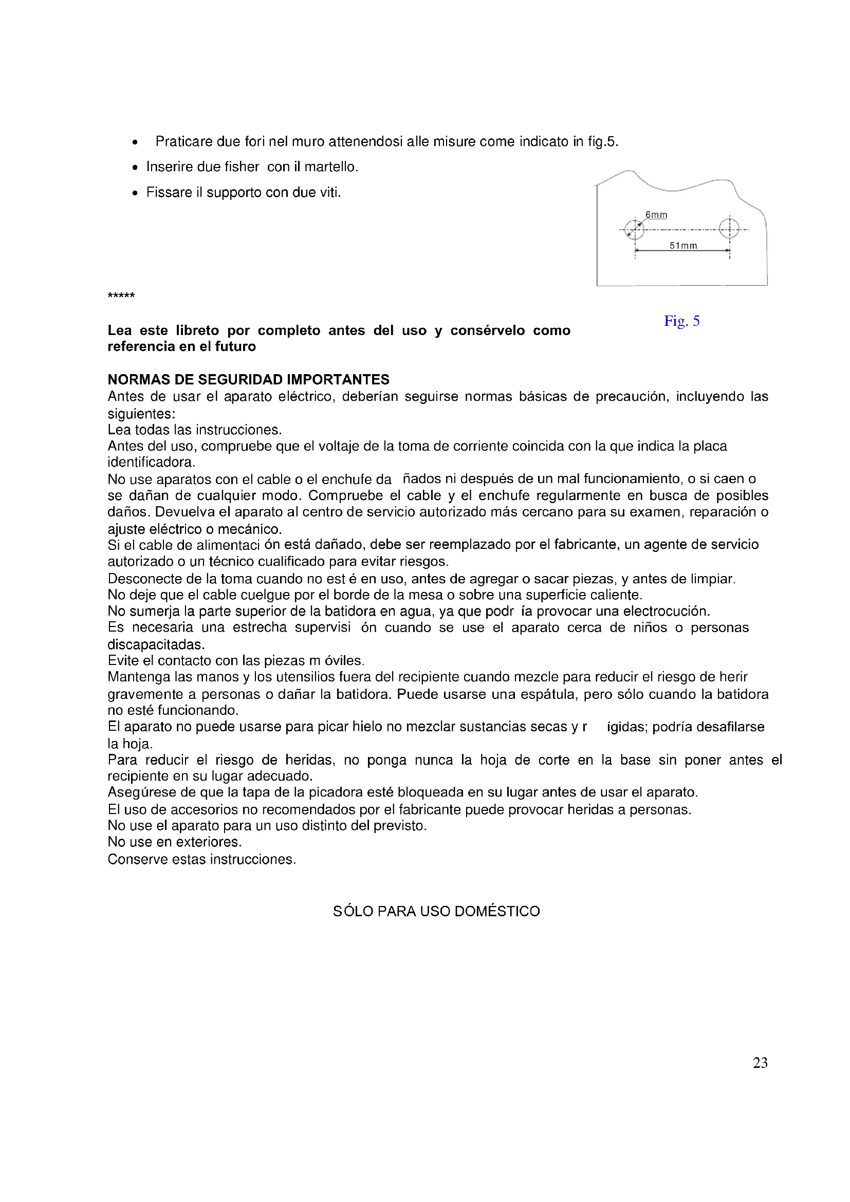 Bloquear27 Puede fijar el soporte de pared como se indica a continuación: Taladre dos agujeros iguales en la pared y siga exactamente las dimensiones indicadas en la fig.5. Ponga dos tacos de plástico dentro con un martillo. Fije el soporte a la pared con dos tornillos.