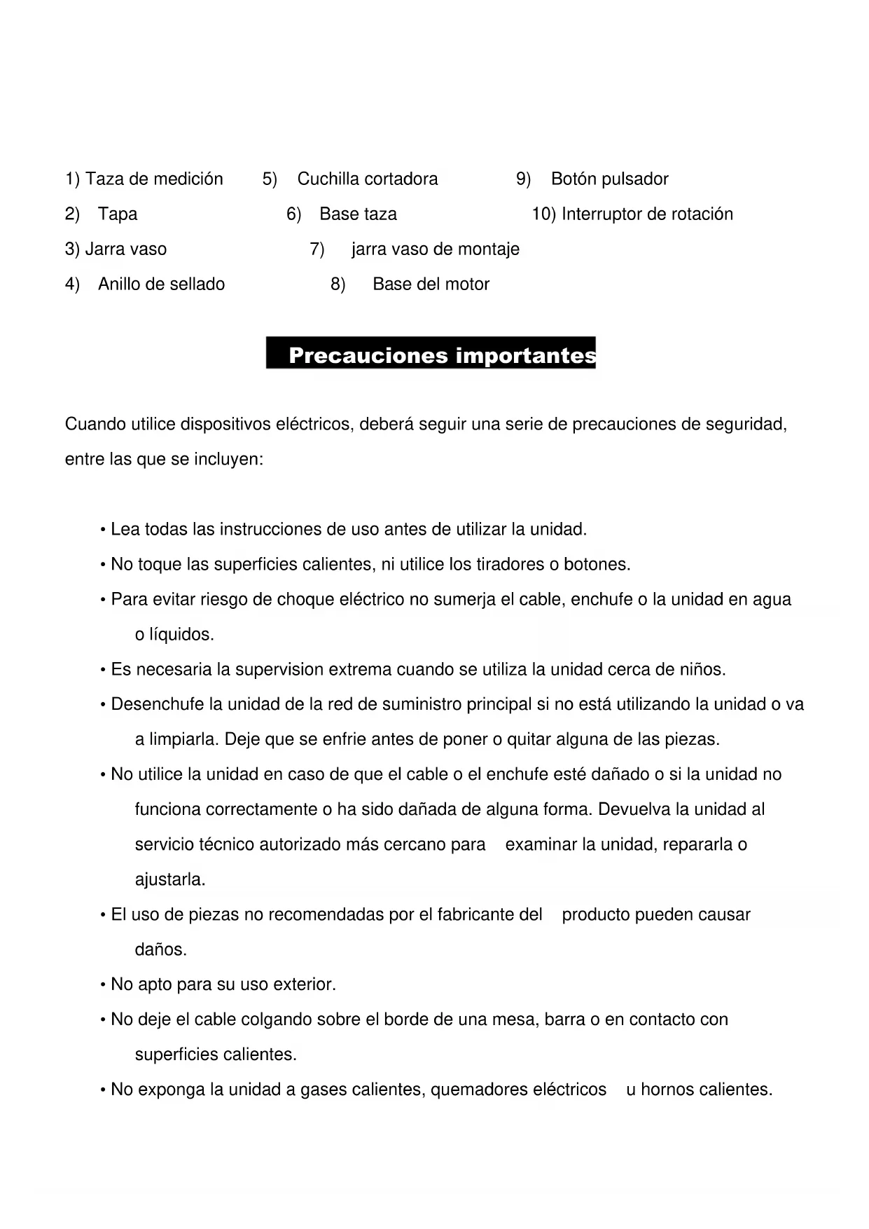 Manual de instrucciones Partes y Contenidos1) Taza de medición 5) Cuchilla cortadora 9) Botón pulsador