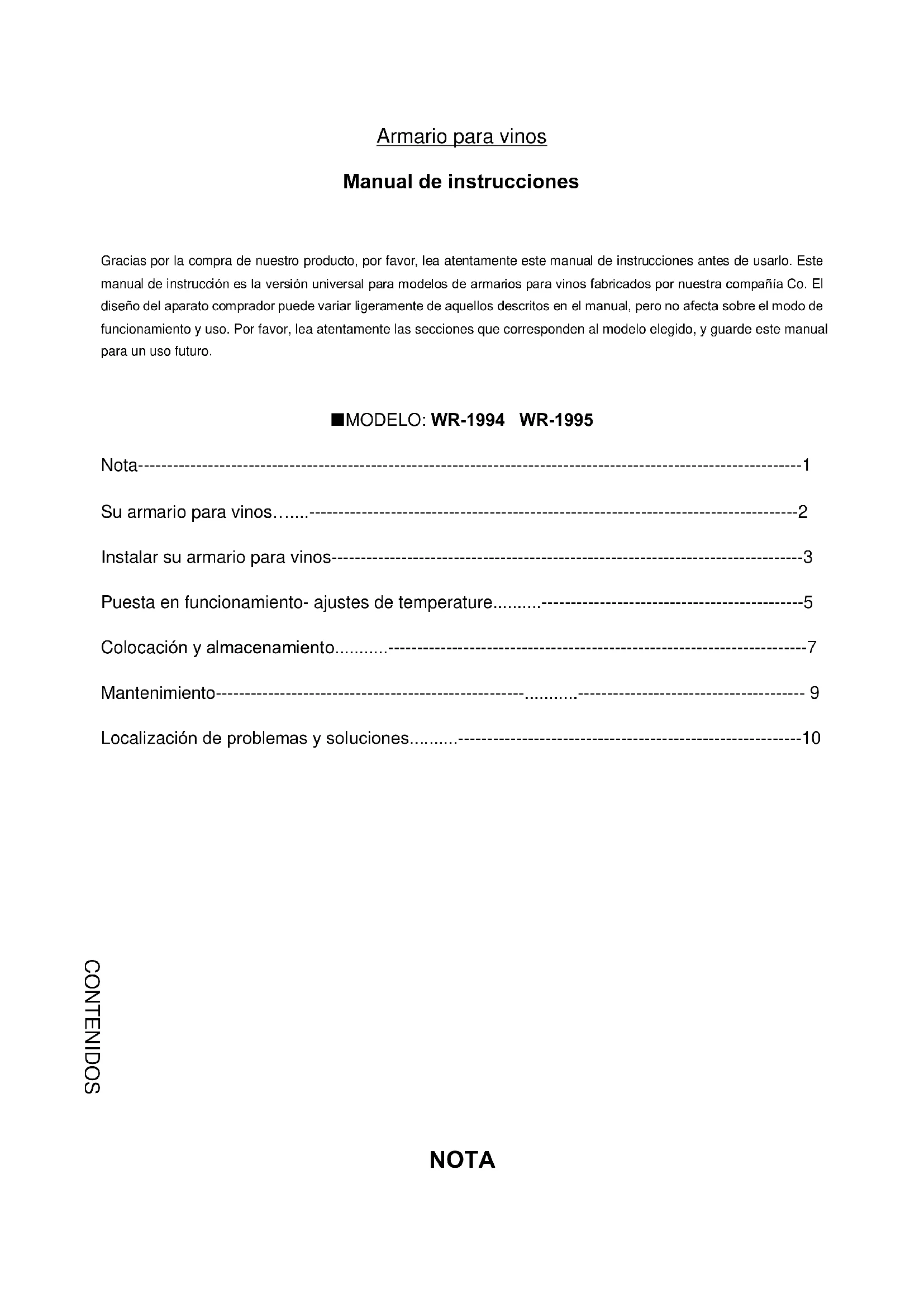Gracias por la compra de nuestro producto, por favor, lea atentamente este manual de instrucciones antes de usarlo. Este manual de instrucción es la versión universal para modelos de armarios para vinos fabricados por nuestra compañía Co. El diseño del aparato comprador puede variar ligeramente de aquellos descritos en el manual, pero no afecta sobre el modo de funcionamiento y uso. Por favor, lea atentamente las secciones que corresponden al modelo elegido, y guarde este manual para un uso futuro.