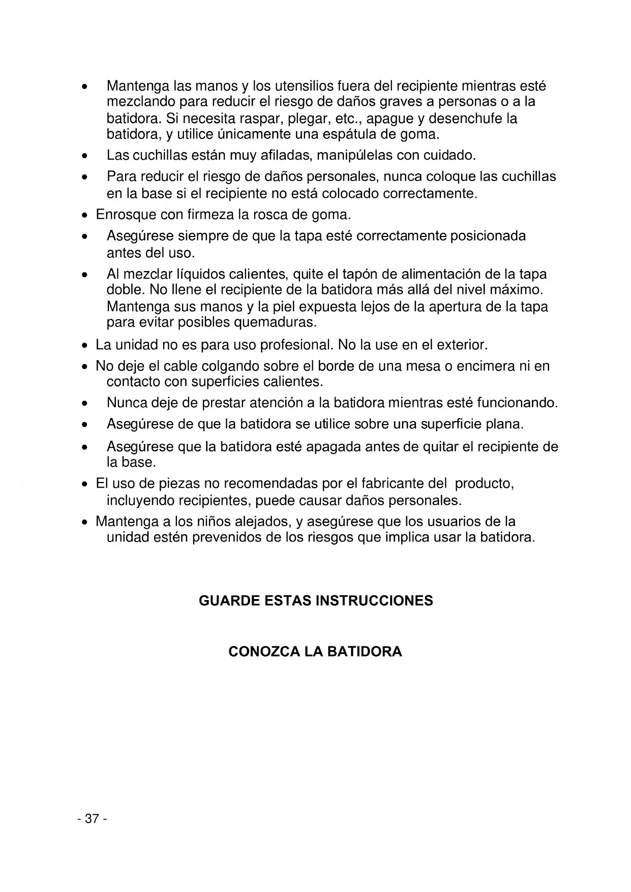 INSTRUCCIONES Lea cuidadosamente estas instrucciones antes del uso. 230V/50Hz/200W PRECAUCIONES IMPORTANTES Cuando utilice dispositivos eléctricos, deberá seguir una serie de precauciones de seguridad, incluyendo las siguientes. Lea todas las instrucciones del manual cuidadosamente cuando utilice cualquier dispositivo y guárdelas en un lugar seguro. Para evitar riesgo de electrocución, no sumerja la base ni el cable en agua u otro líquido. Es necesaria una estrecha supervisión cuando la unidad sea utilizada por o cerca de niños. Apague y desconecte la unidad del suministro de energía antes de poner o quitar piezas, antes de limpiarla y cuando no la esté utilizando. Evite entrar en contacto con piezas móviles. No utilice ningún aparato con el cable o el enchufe dañados, si la unidad no funciona correctamente, ha caído o ha sido dañada de cualquier forma. Devuelva la unidad al servicio técnico autorizado más cercano para examinarla, repararla, o ajustarla eléctrica o mecánicamente.- 37 - Mantenga las manos y los utensilios fuera del recipiente mientras esté mezclando para reducir el riesgo de daños graves a personas o a la batidora. Si necesita raspar, plegar, etc., apague y desenchufe la batidora, y utilice únicamente una espátula de goma. Las cuchillas están muy afiladas, manipúlelas con cuidado. Para reducir el riesgo de daños personales, nunca coloque las cuchillas en la base si el recipiente no está colocado correctamente. Enrosque con firmeza la rosca de goma. Asegúrese siempre de que la tapa esté correctamente posicionada antes del uso. Al mezclar líquidos calientes, quite el tapón de alimentación de la tapa doble. No llene el recipiente de la batidora más allá del nivel máximo. Mantenga sus manos y la piel expuesta lejos de la apertura de la tapa para evitar posibles quemaduras. La unidad no es para uso profesional. No la use en el exterior. No deje el cable colgando sobre el borde de una mesa o encimera ni en contacto con superficies calientes. Nunca deje de prestar atención a la batidora mientras esté funcionando. Asegúrese de que la batidora se utilice sobre una superficie plana. Asegúrese que la batidora esté apagada antes de quitar el recipiente de la base. El uso de piezas no recomendadas por el fabricante del producto, incluyendo recipientes, puede causar daños personales. Mantenga a los niños alejados, y asegúrese que los usuarios de la unidad estén prevenidos de los riesgos que implica usar la batidora.