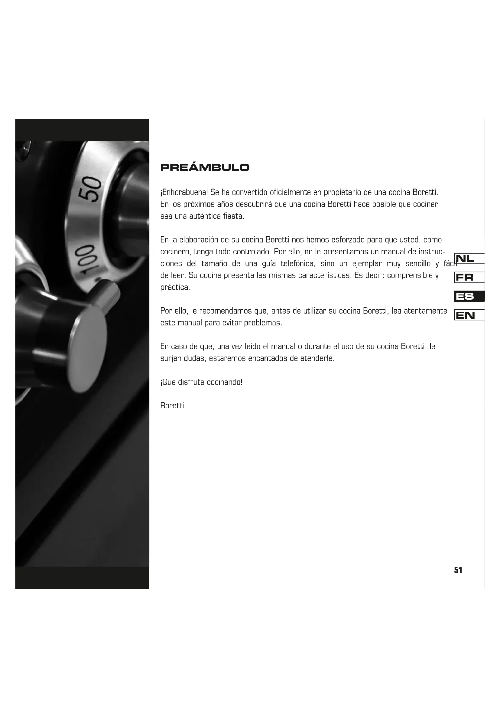 PREÁMBULO ¡Enhorabuena! Se ha convertido oficialmente en propietario de una cocina Boretti. En los próximos años descubrirá que una cocina Boretti hace posible que cocinar sea una auténtica fiesta. En la elaboración de su cocina Boretti nos hemos esforzado para que usted, como cocinero, tenga todo controlado. Por ello, no le presentamos un manual de instruc- ciones del tamaño de una guía telefónica, sino un ejemplar muy sencillo y fácil de leer. Su cocina presenta las mismas características. Es decir: comprensible y práctica. Por ello, le recomendamos que, antes de utilizar su cocina Boretti, lea atentamente este manual para evitar problemas. En caso de que, una vez leído el manual o durante el uso de su cocina Boretti, le surjan dudas, estaremos encantados de atenderle. ¡Que disfrute cocinando! Boretti52 Índice Preámbulo Para el instalador 53 – Información general de instalación – Conexión eléctrica – Conexión de gas Antes del primer uso 55 – Normas de seguridad – Normas medioambientales – Limpieza antes del primer uso Funcionamiento del programador digital 57 – Ajuste de la hora correcta – Función manual – Ajuste de la seña sonora – El temporizador – Funciones automáticas de horneado Funcionamiento del programador digital de un horno de gas 59 – Ajuste de la hora correcta – Ajuste del temporizador – Ajuste de la señal sonora Funcionamiento del programador analógico 60 – Ajuste de la hora correcta – Función manual – El temporizador con señal automática – Funciones automáticas de horneado Explicación general sobre el uso del horno 61 – Descripción de las diversas funciones del horno – La función Quickstart – El grill – El uso del asador – La refrigeración perimetral – Desmontaje de la puerta del horno – Desmontaje del cristal del horno – Desmontaje y extración de los elementos interiores del horno – Limpieza de las cavidades del horno – Uso del termómetro sonda – Piedra para pizzas Explicación sobre el uso del horno de gas ventilado 65 – Encendido del horno de gas – El grill en el horno de gas – El ventilador en el horno de gas La superficie de cocción 67 – Aspectos generales de los quemadores de gas – El quemador para wok – El Fry-top – Limpieza del Fry-top – El Coupe de Feu – Ajuste de los quemadores de gas – Plancha de acero fundido – Limpieza de las superficies de cocción – La placa vitrocerámica Datos técnicos 71 – Tabla de valores para el termómetro sonda – Solución a sus problemas – Esquemas de conexión – Potencias y valores53