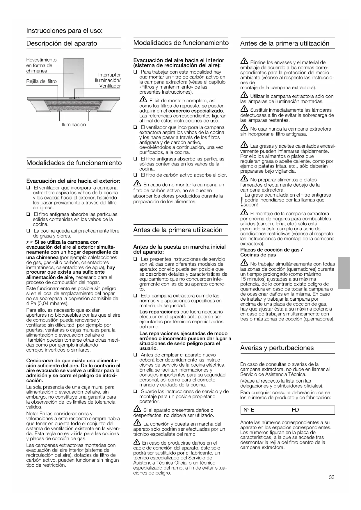 Descripción del aparato Modalidades de funcionamiento Evacuación del aire hacia el exterior:q El ventilador que incorpora la campana extractora aspira los vahos de la cocinay los evacúa hacia el exterior, haciéndo-los pasar previamente a través del filtro antigrasa.q El filtro antigrasa absorbe las partículassólidas contenidas en los vahos de lacocina.q La cocina queda así prácticamente librede grasa y olores. Si se utiliza la campana con evacuación del aire al exterior simultá-neamente con un hogar dependiente deuna chimenea (por ejemplo calefaccionesde gas, gas-oil o carbón, calentadoresinstantáneos, calentadores de agua), hayprocurar que exista una suficiente alimentación de aire, necesario para elproceso de combustión del hogar.Este funcionamiento es posible sin peligrosi en el local de emplazamiento del hogarno se sobrepasa la depresión admisible de4 Pa (0,04 mbares).Para ello, es necesario que existan aperturas no bloqueables por las que el airede combustión pueda renovarse y ventilarse sin dificultad, por ejemplo porpuertas, ventanas o cajas murales para laalimentación o evacuación del aire otambién pueden tomarse otras otras medi-das como por ejemplo instalando cerrojos invertidos o similares. Instrucciones para el uso: Modalidades de funcionamiento Cerciorarse de que existe una alimenta-ción suficiente del aire. De lo contrario elaire evacuado se vuelve a utilizar para laadmisión y se corre el peligro de intoxi-cación.La sola presencia de una caja mural paraalimentación o evacuación del aire, sinembargo, no constituye una garantía parala observación de los límites de toleranciaválidos.Nota: En las consideraciones y valoraciones a este respecto siempre habráque tener en cuenta todo el conjunto delsistema de ventilación existente en la vivien-da. Esta regla no es válida para las cocinasy placas de cocción de gas. Las campanas extractoras montadas conevacuación del aire interior (sistema derecirculación del aire), dotadas de filtro decarbón activo, pueden funcionar sin ningúntipo de restricción. Iluminación Rejilla del filtroRevestimientoen forma dechimeneaInterruptorIluminación/VentiladorEvacuación del aire hacia el interior(sistema de recirculación del aire):q Para trabajar con esta modalidad hayque montar un filtro de carbón activo enla campana extractora (véase el capítulo«Filtros y mantenimiento» de las presentes Instrucciones). 몇 El kit de montaje completo, así como los filtros de repuesto, se pueden adquirir en el comercio especializado.Las referencias correspondientes figuran al final de estas instrucciones de uso.q El ventilador que incorpora la campanaextractora aspira los vahos de la cocinay los hace pasar a través de los filtrosantigrasa y de carbón activo, devolviéndolos a continuación, una vezpurificados, a la cocina.q El filtro antigrasa absorbe las partículassólidas contenidas en los vahos de lacocina.q El filtro de carbón activo absorbe el olor. 몇 En caso de no montar la campana un filtro de carbón activo, no se pueden absorber los olores producidos durante lapreparación de los alimentos. Antes de la primera utilización Antes de la primera utilización Antes de la puesta en marcha inicialdel aparato:q Las presentes instrucciones de servicioson válidas para diferentes modelos deaparato; por ello puede ser posible quese describan detalles y características deequipamiento que no concuerden ínte-gramente con las de su aparato concre- to. q Esta campana extractora cumple las normas y disposiciones específicas en materia de seguridad.Las reparaciones que fuera necesarioefectuar en el aparato sólo podrán serejecutadas por técnicos especializadosdel ramo.Las reparaciones ejecutadas de modo erróneo o incorrecto pueden dar lugar asituaciones de serio peligro para elusuario.q Antes de emplear el aparato nuevodeberá leer detenidamente las instruc-ciones de servicio de la cocina eléctrica. En ella se facilitan informaciones y consejos importantes para su seguridadpersonal, así como para el correctomanejo y cuidado de la cocina.q Guarde las instrucciones de servicio y demontaje para un posible propietarioposterior. 몇 Si el aparato presentara daños o desperfectos, no deberá ser utilizado. 몇 La conexión y puesta en marcha del aparato sólo podrán ser efectuadas por untécnico especialista del ramo. 몇 En caso de producirse daños en el cable de conexión del aparato, éste sólopodrá ser sustituido por el fabricante, untécnico especializado del Servicio deAsistencia Técnica Oficial o un técnicoespecializado del ramo, a fin de evitar situa-ciones de peligro. 몇 Las grasas y aceites calentados excesi- vamente pueden inflamarse rápidamente.Por ello los alimentos o platos que requieran grasa o aceite caliente, como porejemplo patatas fritas, etc., sólo deberánprepararse bajo vigilancia. 몇 No preparar alimentos o platos flameados directamente debajo de la campana extractora.La grasa acumulada en el filtro antigrasapodría incendiarse por las llamas que !suben! 몇 El montaje de la campana extractora por encima de hogares para combustiblessólidos (carbón, leña, etc.) sólo está permitido si ésta cumple una serie de condiciones restrictivas (véanse al respectolas instrucciones de montaje de la campanaextractora).Placas de cocción de gas / Cocinas de gas 몇 No trabajar simultáneamente con todas las zonas de cocción (quemadores) duranteun tiempo prolongado (como máximo 15 minutos) ajustadas a su máxima potencia, de lo contrario existe peligro dequemadura en caso de tocar la campana ode ocasionar daños en la misma. En casode instalar y trabajar la campana por encima de una placa de cocción de gas,hay que ajustar ésta a su máxima potenciaen caso de trabajar simultáneamente contres o más zonas de cocción (quemadores). Averías y perturbaciones En caso de consultas o averías de la campana extractora, no dude en llamar alServicio de Asistencia Técnica. (Véase al respecto la lista co