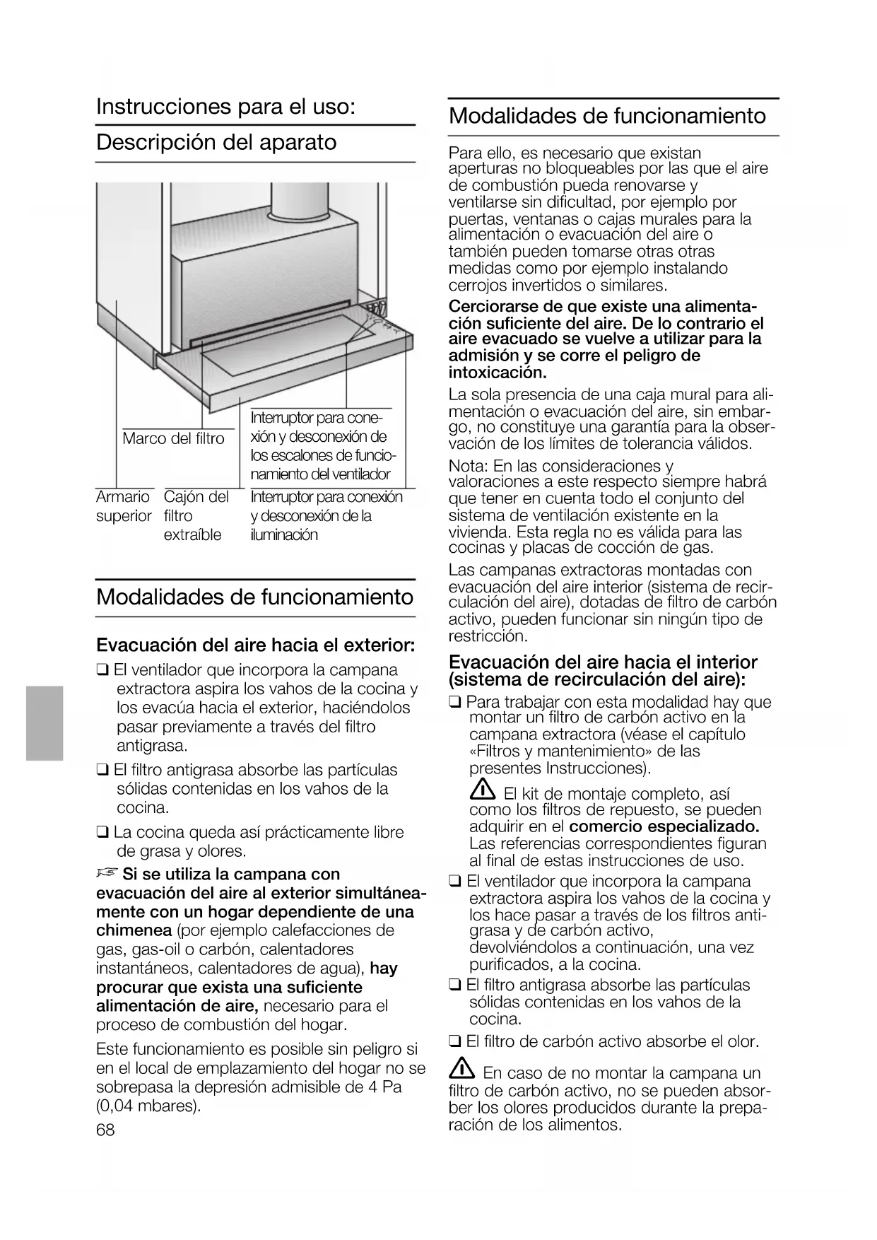 terminal marked ‘L’, or coloured red.Modalidades de funcionamiento Para ello, es necesario que existan aperturas no bloqueables por las que el aire de combustión pueda renovarse y ventilarse sin dificultad, por ejemplo por puertas, ventanas o cajas murales para la alimentación o evacuación del aire o también pueden tomarse otras otras medidas como por ejemplo instalando cerrojos invertidos o similares. Cerciorarse de que existe una alimenta- ción suficiente del aire. De lo contrario el aire evacuado se vuelve a utilizar para la admisión y se corre el peligro de intoxicación. La sola presencia de una caja mural para ali- mentación o evacuación del aire, sin embar- go, no constituye una garantía para la obser- vación de los límites de tolerancia válidos. Nota: En las consideraciones y valoraciones a este respecto siempre habrá que tener en cuenta todo el conjunto del sistema de ventilación existente en la vivienda. Esta regla no es válida para las cocinas y placas de cocción de gas. Las campanas extractoras montadas con evacuación del aire interior (sistema de recir- culación del aire), dotadas de filtro de carbón activo, pueden funcionar sin ningún tipo de restricción. Evacuación del aire hacia el interior (sistema de recirculación del aire): ❑ Para trabajar con esta modalidad hay que montar un filtro de carbón activo en la campana extractora (véase el capítulo «Filtros y mantenimiento» de las presentes Instrucciones). 몇 El kit de montaje completo, así como los filtros de repuesto, se pueden adquirir en el comercio especializado. Las referencias correspondientes figuran al final de estas instrucciones de uso. ❑ El ventilador que incorpora la campana extractora aspira los vahos de la cocina y los hace pasar a través de los filtros anti- grasa y de carbón activo, devolviéndolos a continuación, una vez purificados, a la cocina. ❑ El filtro antigrasa absorbe las partículas sólidas contenidas en los vahos de la cocina. ❑ El filtro de carbón activo absorbe el olor. 몇 En caso de no montar la campana un filtro de carbón activo, no se pueden absor- ber los olores producidos durante la prepa- ración de los alimentos. Descripción del aparato Instrucciones para el uso: Modalidades de funcionamiento Evacuación del aire hacia el exterior: ❑ El ventilador que incorpora la campana extractora aspira los vahos de la cocina y los evacúa hacia el exterior, haciéndolos pasar previamente a través del filtro antigrasa. ❑ El filtro antigrasa absorbe las partículas sólidas contenidas en los vahos de la cocina. ❑ La cocina queda así prácticamente libre de grasa y olores.