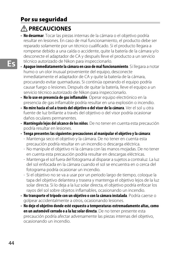 • Apague inmediatamente la cámara en caso de mal funcionamiento. Si llegara a notar humo o un olor inusual proveniente del equipo, desconecte inmediatamente el adaptador de CA y quite la batería de la cámara, procurando evitar quemaduras. Si continúa operando el equipo podría causar fuego o lesiones. Después de quitar la batería, lleve el equipo a un servicio técnico autorizado de Nikon para inspeccionarlo. • No lo use en presencia de gas inflamable. Operar equipo electrónico en la presencia de gas inflamable podría resultar en una explosión o incendio. • No mire hacia el sol a través del objetivo o del visor de la cámara. Ver el sol u otra fuente de luz brillante a través del objetivo o del visor podría ocasionar daños oculares permanentes. • Manténgalo lejos del alcance de los niños. De no tener en cuenta esta precaución podría resultar en lesiones. • Tenga presentes las siguientes precauciones al manipular el objetivo y la cámara: - Mantenga seco el objetivo y la cámara. De no tener en cuenta esta precaución podría resultar en un incendio o descarga eléctrica. - No manipule el objetivo ni la cámara con las manos mojadas. De no tener en cuenta esta precaución podría resultar en descargas eléctricas. - Mantenga el sol fuera del fotograma al disparar a sujetos a contraluz. La luz del sol enfocada en la cámara cuando el sol se encuentra en o cerca del fotograma podría ocasionar un incendio. - Si el objetivo no se va a usar por un periodo largo de tiempo, coloque la tapa del objetivo delantera y trasera y mantenga el objetivo lejos de la luz solar directa. Si lo deja a la luz solar directa, el objetivo podría enfocar los rayos del sol sobre objetos inflamables, ocasionando un incendio. • No transporte el trípode con un objetivo o con la cámara instalada. Podría caerse o golpear accidentalmente a otros, ocasionando lesiones. • No deje el objetivo donde esté expuesto a temperaturas extremadamente altas, como en un automóvil cerrado o a la luz solar directa. De no tener presente esta precaución podría afectar adversamente las piezas internas del objetivo, ocasionando un incendio.