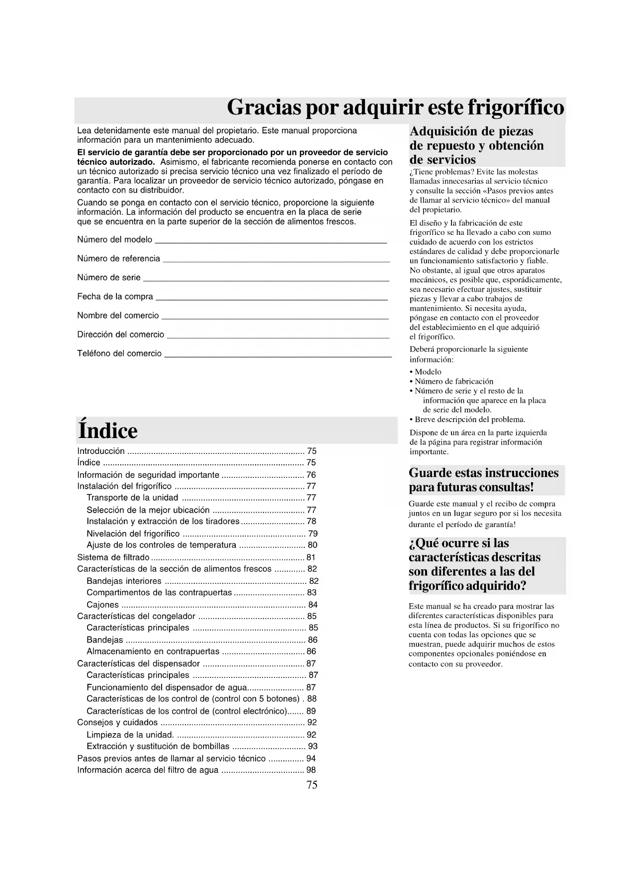 El Diseño y la fabricación de este frigorífico se ha llévado a cabo con sumocuidado de acuwordo con los strictosestandares de calidad y debe proportargarle un funciona satisfactorio y fiable.No obstarce, al igual que others aparatos mecánicos, es posible que, esporadically,sea necessario efectuar ajustes, sustituirpiezas y lllevar a cabo trabajo demantenimiento. Si necessitiesayuda,pongase en contacto con el provcededor delestablishcimiento en el que adquirióel frigorífico.