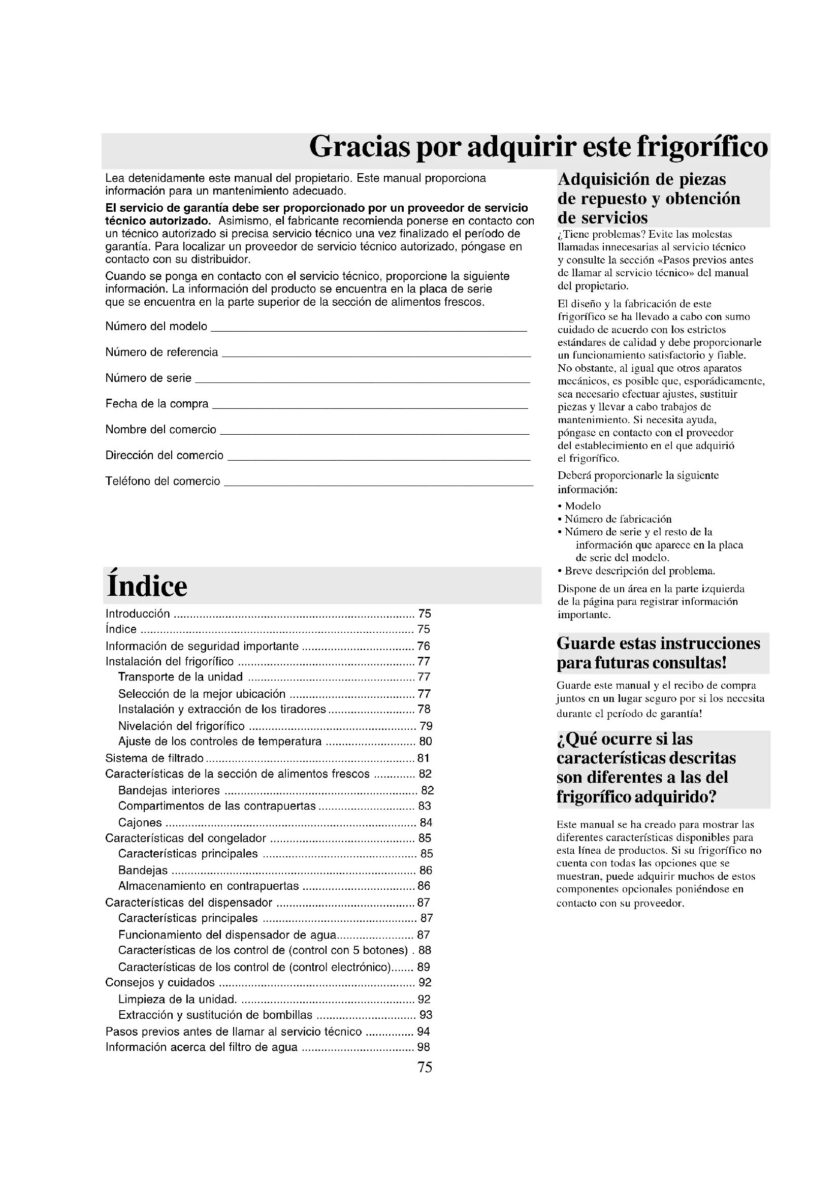 El Diseño y la fabricación de este frigorífico se ha(LLVado a cabo con sumocuidado de acuRDco con los strictosestandares de calidad y debe proportiarle unfuncionamento satisfactorio y fiable.No obstante, al igual queothers aparatosmecanicos, es possible que,esperadically,sea necessario efectuarajustes,susituirpiezas y llhear a cabo travaños delmantimiento. Si necesita ayudapóngase encontacto con elprovcededorestablishcimiento enelque adquirielfrigorífico.