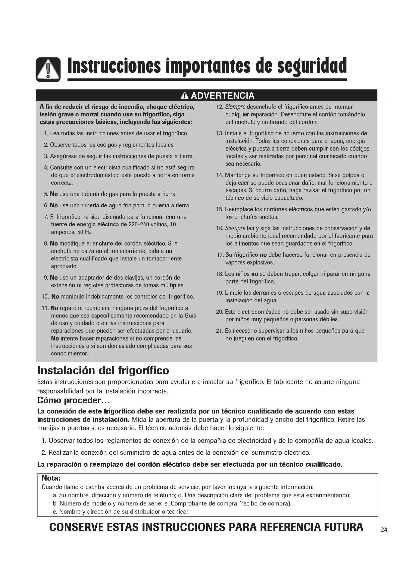 - Instale el frigorífico de acuerdo con las instrucciones de instalación. Todas las conexiones para el agua, energia electrica y puesta a tierra deben cumplir con loscottigos locales y ser realizadas por personalriallicado cuando sea necessario.