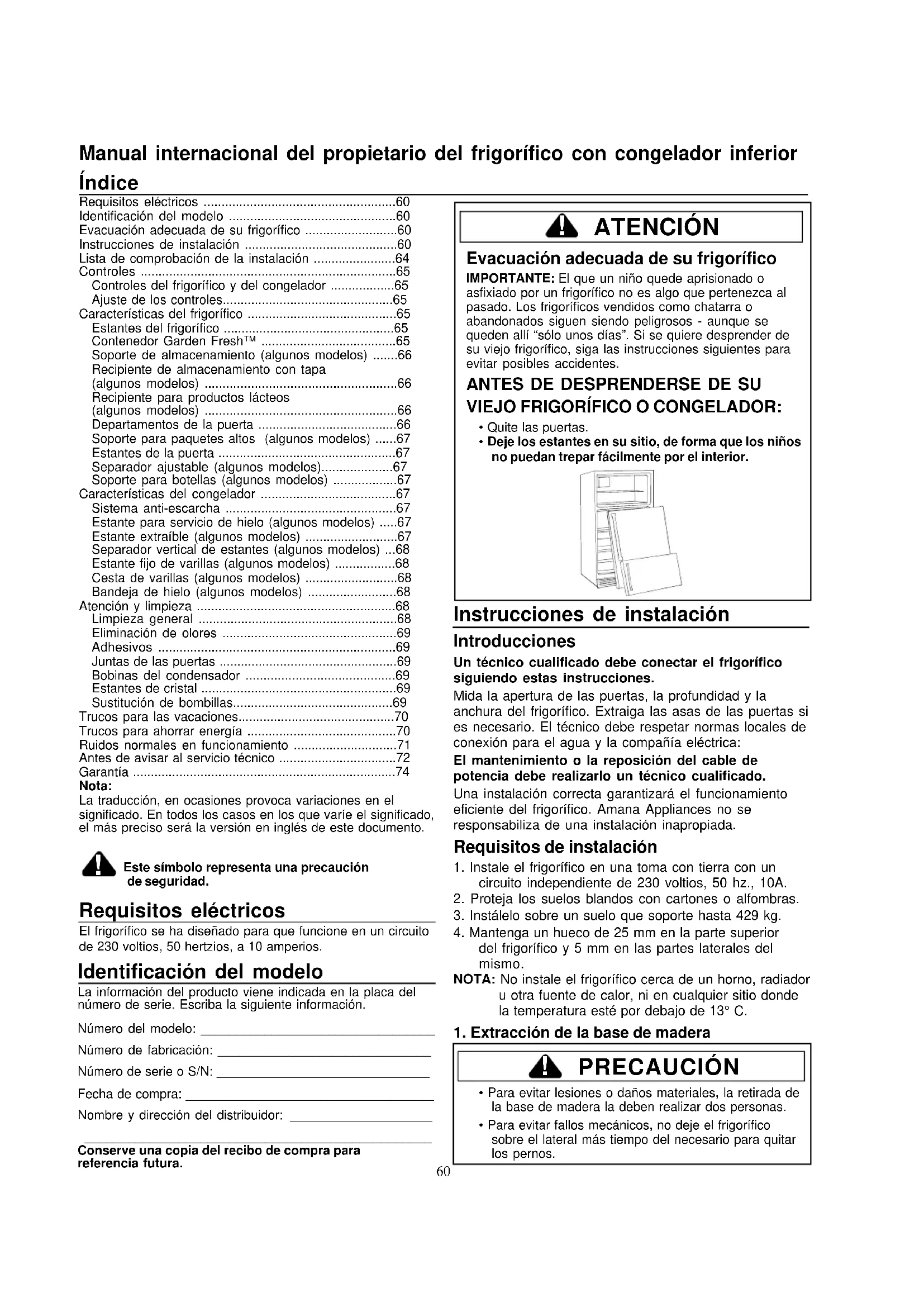 Una instalación correcta garantizará el funcionalemente del frigorífico. Amana Appliances no seresponsibiliza de una instalación inapropiada.