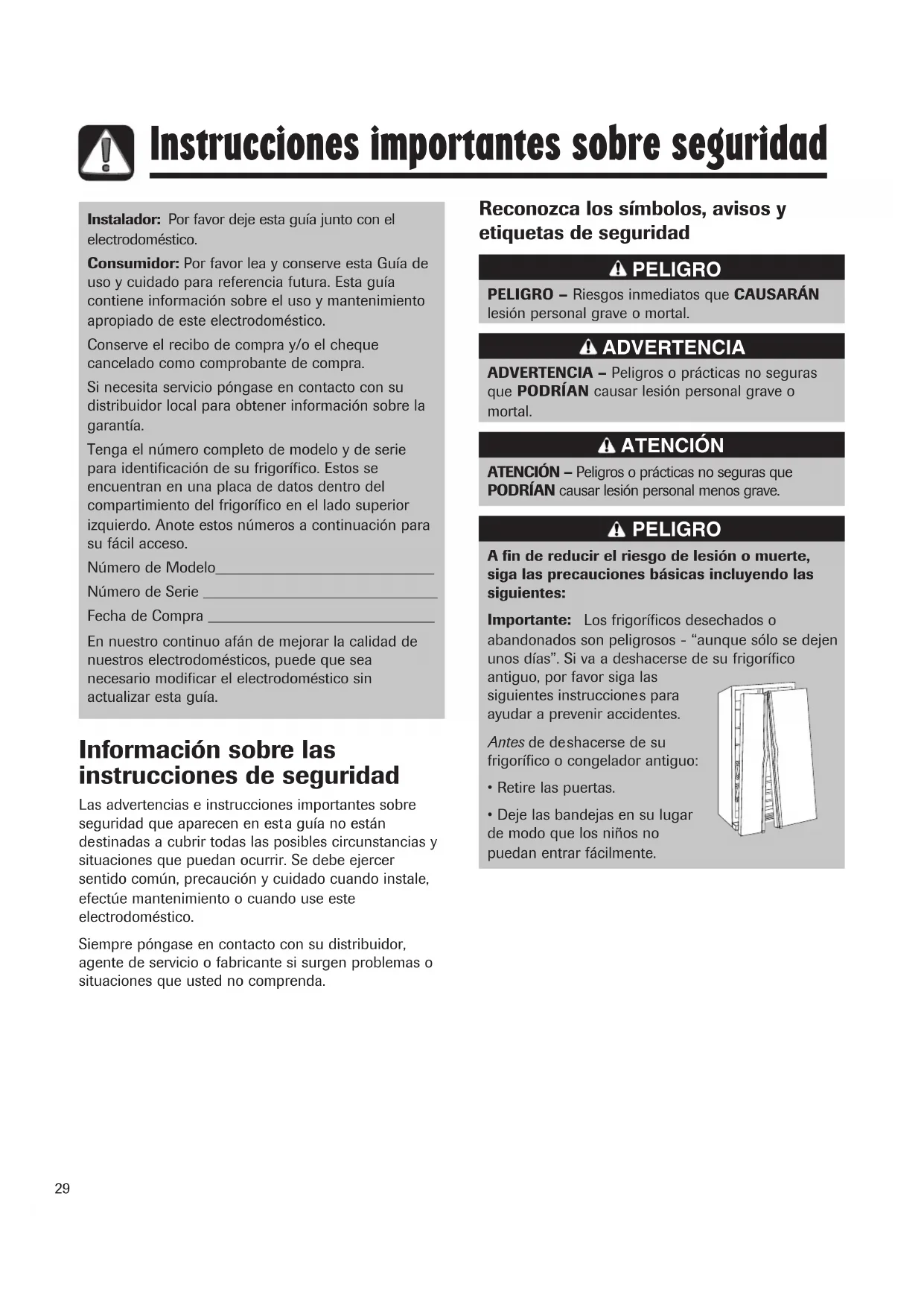 stinadas a cubrir todas las posibles circunstancias y situaciones que puedan ocurrir. Se debe ejercer sentido común, precaución y cuidado cuando instale, efectúe mantenimiento o cuando use este electrodoméstico. Siempre póngase en contacto con su distribuidor, agente de servicio o fabric ante si surgen problemas o situaciones que usted no comprenda. Instalador: Por favor deje esta guía junto con el electrodoméstico. Consumidor: Por favor lea y conserve esta Guía de uso y cuidado para referencia futura. Esta guía contiene información sobre el uso y mantenimiento apropiado de este electrodoméstico. Conserve el recibo de compra y/o el cheque cancelado como comprobante de compra. Si necesita servicio póngase en contacto con su distribuidor local para obtener información sobre la garantía. Tenga el número completo de modelo y de serie para identificación de su frigorífico. Estos se encuentran en una placa de datos dentro del compartimiento del frigorífico en el lado superior izquierdo. Anote e stos números a continuación para su fácil acceso. Número de Modelo____________________________ Número de Serie ______________________________ Fecha de Compra _____________________________ En nuestro continuo afán de mejorar la calidad de nuestros electrodomésticos, puede que sea necesario modificar el electrodoméstico sin actualizar e sta guía. A fin de reducir el riesgo de lesión o muerte, siga las pr ecauciones básicas incluyendo las siguientes: Importante: Los frigoríficos desechados o abandonados son peligrosos - “aunque sólo se dejen unos días”. Si va a deshacerse de su frigorífico antiguo, por favor siga las siguientes instruccione s para ayudar a prevenir accidentes. Antes de de shacerse de su frigorífico o congelador antiguo:
