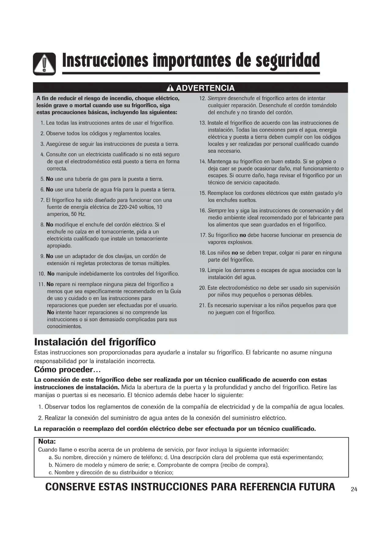 - Notes22 Frigorífico Guía de uso y cuidado Instrucciones importantes sobre seguridad p. 23
