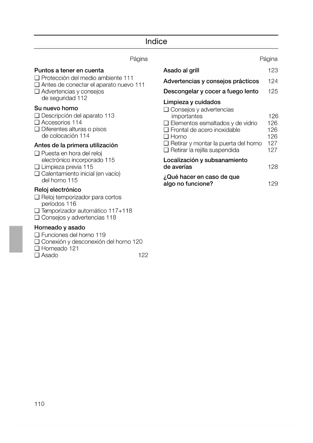 , para grandes trozos de carne con grasa. ❑ Colocar la parrilla en la bandeja universal recogedora de grasa. La parrilla contri- buye a evitar que el horno quede sucio. ❑ La grasa y el jugo del asado son recogidos en la bandeja universal ❑ Con la parrilla de asado puede cocinarse la carne a una temperatura algo superior a la indicada en la correspondiente tabla o receta, para el caso de de desear que la carne tenga una corteza crujiente.123 Asado al grill Asado con grill de superficies Z Para platos pequeños y planos. ❑ Utilizar siempre conjuntamente la parilla yla bandeja universal. ❑ Dar la vuelta a la pieza a asar una vez transcurridas las dos terceras partes del tiempo de asado prescrito. ❑ Untar ligeramente la parrilla y el alimento de aceite. ❑ Colocar siempre la carne en el centro de la parrilla. ❑ Si el cuerpo de calefacción del grill se desconectara, ello es debido a la acti- vación del circuito protector contra sobrecalentamiento. El cuerpo de cale- facción volverá a conectarse al cabo de unos breves instantes. ❑ Colocar la parrilla en la bandeja universal recogedora de grasa. Introducirla conjuntamente con ésta en el mismo piso (altura). el quemado y la incrustación de los restos de alimentos en el horno. ❑ Dar la vuelta a las aves enteras una vez transcurridas las dos terceras partes de su tiempo de asado. En los asados de pato y ganso, pinchar la piel debajo de las alas a fin de permitir la salida de la grasa. ❑ Una vez transcurrido el tiempo de asado prescrito, dejar reposar la carne durante unos 10 minutos aproximadamente en el horno desconectado y cerrado. Prestar atención al asar al grill. ! Mantener alejados los niños de la cocina durante las operaciones. Atención: ❑ Asar al grill con la puerta cerrada. ❑ Las temperaturas del asado al grill pueden regularse. ❑ Introducir siempre conjuntamente la bandeja universal y la parrilla. Asado con grill con aire caliente I Para pollos o asados de carne particular- mente crujientes (asado de cerdo con corteza). ❑ Utilizar la parrilla y la bandeja universal. Emplear preferentemente para el asado de carne recipientes con asas resistentes al calor. Volver las grandes piezas una vez transcurrida la mitad del tiempo de asado prescrito. ❑ No colocar los recipientes o utensilios de vidrio usados que estuvieran calientes, sobre bases frías o húmedas sino sobre sobre un paño de cocina seco, a fin de evitar que el vidrio salte. ❑ Al realizar el asado al grill con aire caliente sobre la parrilla, puede originarse un mayor grado de suciedad en el horno. Por ello deberá limpiarse el horno tras cada sesión de trabajo, a fin de evitar124 Advertencias y consejos prácticos Para ahorrar energía: ❑ Calentar el horno previamente sólo en caso de exigirlo la receta del plato a cocinar. ❑ Los moldes oscuros absorben mejor el calor. ❑ Calor residual: En los procesos de horneado o asado prolongados, puede desconectarse el horno 5 a 10 minutos antes de alcanzar el tiempo de horneado prescrito. Para el horneado: ❑ El pastel colocado sobre la bandeja no está suficientemente cocido por abajo ❑ El pastel de molde está demasiado claro por abajo. ❑ El pastel o las pastas están demasiado tostadas por abajo. ❑ El pastel está demasiado seco. ❑ El pastel está falto de consistencia o pastoso por dentro, o la carne no está bien hecha por dentro. ❑ Al trabajar con la modalidad «Aire caliente forzado» los pasteles en moldes redondos o rectangulares se tuestan demasiado por detrás. ❑ Al preparar alimentos horneados o asados muy húmedos p.e. tarta de frutas o asados con agua, se produce gran cantidad de vapor de agua en el horno, que se precipita sobre la puerta del mismo, pudiendo gotear sobre el piso o el mueble empotrado. Retirar las bandejas de horneado o univer- sales que no vayan a usarse, del horno. No colocar el molde sobre la bandeja de horneado, sino sobre la parrilla. Colocar el pastel o las pastas en un piso más elevado. Aumentar algo la temperatura ajustada del horno. Seleccionar un tiempo de horneado más corto. Reducir algo las temperaturas de horneado o asado ajustadas. Atención: Los tiempos de horneado o asado no se pueden acortar aumentando las temperaturas (alimentos tostados por fuera, enteros o crudos por dentro). Seleccionar unos tiempos de horneado o asado más largos. Dejar reposar la masa. Poner menos líquido en la masa. No colocar el molde directamente delante de las salidas de aire en la pared de fondo del horno. Abriendo varias veces por breve tiempo la puerta del horno (una a dos veces en largos tiempos de horneado o asado), puede evacuarse el vapor de agua acumulado en el interior del horno, con lo que se reduce sensiblemente el peligro de goteo.125 Descongelar y preparar al horno Descongelar y preparar al horno con la modilidad «Aire caliente forzado