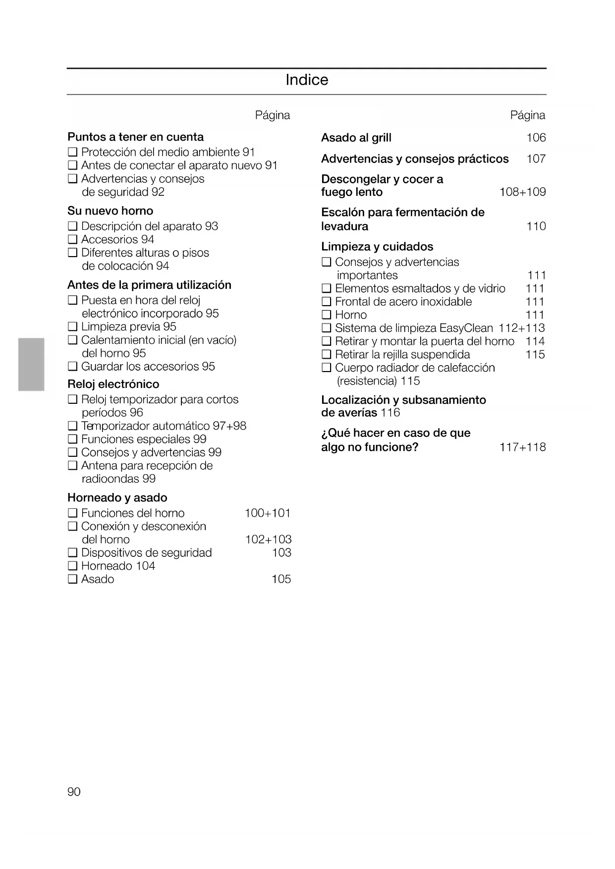 – scompare. Che fare in questi casi? Non sempre è necessario telefonare al servizio assistenza clienti. In molti casi potete rimediare Voi stessi. Nella tabella seguente trovate alcuni suggerimenti. Avvertenza fondamentale: I lavori ai componenti elettronici dell'apparecchio devono essere eseguiti solo da un tecnico. Prima di iniziare questi lavori, è indispensabile togliere tensione all'apparecchio, disattivando l'interruttore di sicurezza, oppure svitando i fusibili nella cas- setta delle valvole della Vostra abitazione. Che fare se … Causa possibile Rimedio … il funzionamento generale è distur- bato, p. es. le lampade spia non si accendono più? Fusibile guasto. Controllare il fusibile elettrico nella cassetta delle valvole e sostituire in caso di guasto. … liquido o pasta molto fluida ten- dono a disporsi di lato? L'apparecchio non poggia o non è incassato orizzontale. Verificare il montaggio. … se elementi ad inserimento smal- tati presentano macchie opache, chiare? Fenomeno normale causato dalla caduta di gocce di succo di carne. Non vi è rimedio.89 Che fare in questi casi? Che fare se … Causa possibile Rimedio … se la porta del forno non si sgan- cia? Non è stata mantenuta la posizione obliqua oppure la maniglia è stata sollevata troppo. Controllare l’inclinazione della porta e la posizione della maniglia. … se la porta del forno non si aggan- cia? L’asta trasversale sotto il forno è spostata verso avanti. Spingere l’asta trasversale nella posizione di arresto posteriore. La porta del forno non poggia sul gancio di arresto dell’asta trasversa- le. Controllare l’inclinazione. La maniglia è stata spinta tropo verso l’alto. Controllare la posizione della manig- lia.90 Indice Página Puntos a tener en cuenta ❑ Protección del medio ambiente 91 ❑ Antes de conectar el aparato nuevo 91 ❑ Advertencias y consejos de seguridad 92 Su nuevo horno ❑ Descripción del aparato 93 ❑ Accesorios 94 ❑ Diferentes alturas o pisos de colocación 94 Antes de la primera utilización ❑ Puesta en hora del reloj electrónico incorporado 95 ❑ Limpieza previa 95 ❑ Calentamiento inicial (en vacío) del horno 95 ❑ Guardar los accesorios 95 Reloj electrónico ❑ Reloj temporizador para cortos períodos 96 ❑ Temporizador automático 97+98 ❑ Funciones especiales 99 ❑ Consejos y advertencias 99 ❑ Antena para recepción de radioondas 99 Horneado y asado ❑ Funciones del horno 100+101 ❑ Conexión y desconexión del horno 102+103 ❑ Dispositivos de seguridad 103 ❑ Horneado 104 ❑ Asado 105 Página Asado al grill 106 Advertencias y consejos prácticos 107 Descongelar y cocer a fuego lento 108+109 Escalón para fermentación de levadura 110 Limpieza y cuidados ❑ Consejos y advertencias importantes 111 ❑ Elementos esmaltados y de vidrio 111 ❑ Frontal de acero inoxidable 111 ❑ Horno 111 ❑ Sistema de limpieza EasyClean 112+113 ❑ Retirar y montar la puerta del horno 114 ❑ Retirar la rejilla suspendida 115 ❑ Cuerpo radiador de calefacción (resistencia) 115 Localización y subsanamiento de averías 116 ¿Qué hacer en caso de que algo no funcione? 117+11891 Protección del medio ambiente ❑ Los aparatos usados incorporan materiales valiosos que se pueden recuperar, entregando el aparato a dicho efecto en un centro oficial de recogida o recuperación de materiales reciclables. Antes de deshacerse de su aparato usado deberá inutilizarlo. ❑ Su nuevo aparato está protegido durante el transporte hasta su hogar por un embalaje protector. Todos los materiales de embalaje utilizados son respetuosos con el medio ambiente y pueden ser reciclados o reutilizados. Contribuya activamente a la protección del medio ambiente insistiendo en unos métodos de eliminación y recuperación de los materiales de embalaje respetuosos con el medio ambiente. Antes de conectar el aparato nuevo ❑ Antes de emplear el aparato nuevo deberá leer detenidamente las instrucciones de servicio de la cocina eléctrica. En ella se facilitan informaciones y consejos importantes para su seguridad personal, así como para el correcto manejo y cuidado de la cocina. ❑ Las presentes instrucciones de servicio son válidas para diferentes modelos de aparato; por ello puede ser posible que se describan detalles y características de equipamiento que no concuerden íntegramente con las de su aparato concreto. ❑ Guarde las instrucciones de servicio y de montaje para un posible propietario posterior. ❑ Si el aparato presentara daños o desperfectos, no deberá ser utilizado. ❑ El montaje y acoplamiento del aparato a la red eléctrica sólo deberá ser efectuado por un electricista autorizado, cumpliendo las correspondientes instrucciones y según el esquema de conexión. En caso de efectuarse un acoplamiento erróneo del aparato yproducirse algún daño o desperfecto en su aparato, expirará la garantía del mismo. ❑ Nuestros aparatos cumplen las normas de seguridad específicas del ramo para aparatos eléctricos. Las reparaciones que fuera necesario efectuar sólo podrán ser ejecutadas por técnicos debida- mente instruidos del Servicio Técnico Postventa. Las reparaciones efectuadas de modo erróneo o incorrecto, pueden implicar serios peligros para el usuario. Puntos a tener en cuenta92 Puntos a tener en cuenta Advertencias y consejos de seguridad ❑ Utilice el aparato sólo para la preparación de alimentos. ❑ Las superficies de los dispositivos de calentamiento y de los recipientes de cocción pueden calentarse fuertemente durante su servicio. Lo mismo ocurre con las superficies interiores de los hornos y los elementos de calefacción. Mantenga siempre alejados los niños de la cocina. ❑ Permanezca siempre en las inmediaciones del aparato al preparar platos o alimentos con grasa o aceite. La grasa o aceite excesivamente calentados pueden inflamarse. ❑ Limpie regularmente el horno. Los residuos de grasa o aceite podrían incendiarse cuando el horno está ence