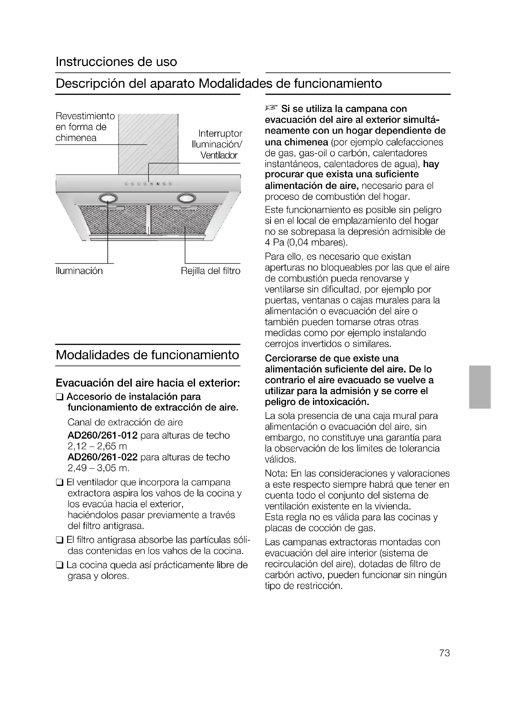 Si se utiliza la campana con evacuación del aire al exterior simultá- neamente con un hogar dependiente de una chimenea (por ejemplo calefacciones de gas, gas-oil o carbón, calentadores instantáneos, calentadores de agua), hay procurar que exista una suficiente alimentación de aire, necesario para el proceso de combustión del hogar. Este funcionamiento es posible sin peligro si en el local de emplazamiento del hogar no se sobrepasa la depresión admisible de 4 Pa (0,04 mbares). Para ello, es necesario que existan aperturas no bloqueables por las que el aire de combustión pueda renovarse y ventilarse sin dificultad, por ejemplo por puertas, ventanas o cajas murales para la alimentación o evacuación del aire o también pueden tomarse otras otras medidas como por ejemplo instalando cerrojos invertidos o similares. Cerciorarse de que existe una alimentación suficiente del aire. De lo contrario el aire evacuado se vuelve a utilizar para la admisión y se corre el peligro de intoxicación. La sola presencia de una caja mural para alimentación o evacuación del aire, sin embargo, no constituye una garantía para la observación de los límites de tolerancia válidos. Nota: En las consideraciones y valoraciones a este respecto siempre habrá que tener en cuenta todo el conjunto del sistema de ventilación existente en la vivienda. Esta regla no es válida para las cocinas y placas de cocción de gas. Las campanas extractoras montadas con evacuación del aire interior (sistema de recirculación del aire), dotadas de filtro de carbón activo, pueden funcionar sin ningún tipo de restricción. Iluminación Interruptor Iluminación/ Ventilador Rejilla del filtro Revestimiento en forma de chimenea74 Modalidades de funcionamiento Evacuación del aire hacia el interior (sistema de recirculación del aire): ❑ Accesorio de instalación para servicio de recirculación. Canal de recirculación AD260/261-112 para alturas de techo 2,23 – 2,65 m AD260/261-122 para alturas de techo 2,49 – 3,05 m. ❑ Para trabajar con esta modalidad hay que montar un filtro de carbón activo en la campana extractora (véase el capítulo «Filtros y mantenimiento» de las presentes Instrucciones). ❑ El ventilador que incorpora la campana extractora aspira los vahos de la cocina y los hace pasar a través de los filtros antigrasa y de carbón activo, devolvién- dolos a continuación, una vez purificados, a la cocina. ❑ El filtro antigrasa absorbe las partículas sólidas contenidas en los vahos de la cocina