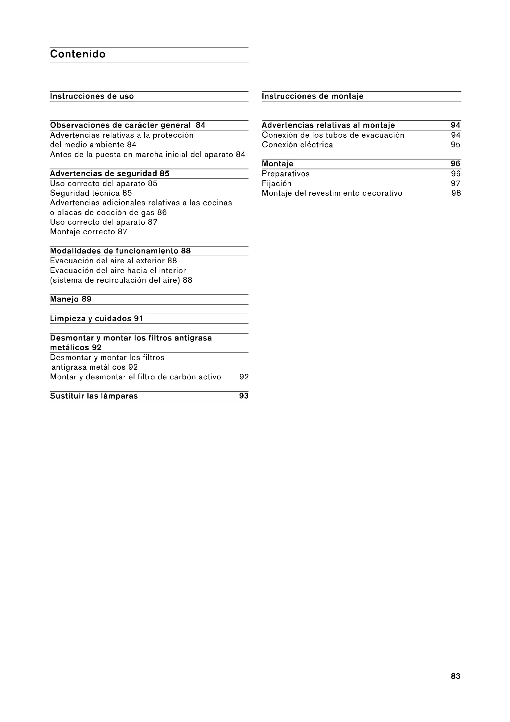 Uso correcto del aparato 85 Seguridad técnica 85 Advertencias adicionales relativas a las cocinas o placas de cocción de gas 86 Uso correcto del aparato 87 Montaje correcto 87