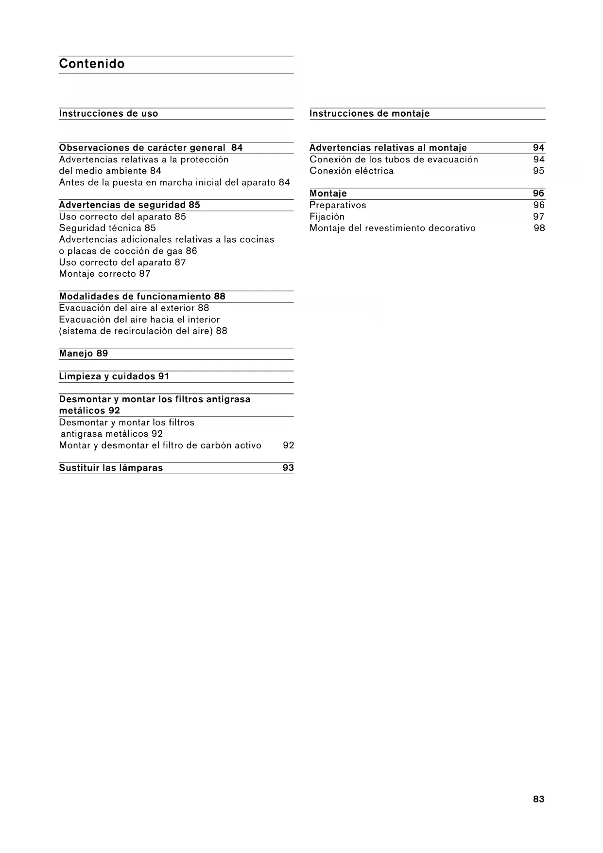 En caso de utilizar la campana con evacuación del aire al exterior simultáneamente con fuentes de calor u hogares dependientes de una chimenea en un recinto cerrado, puede ocurrir que se produzca una excesiva aspiración de aire para la combustión, pudiendo retornar en tal caso los gases de combustión tóxicos al interior del recinto por efecto de la depresión (presión negativa) existente. Advertencias de seguridad $86
