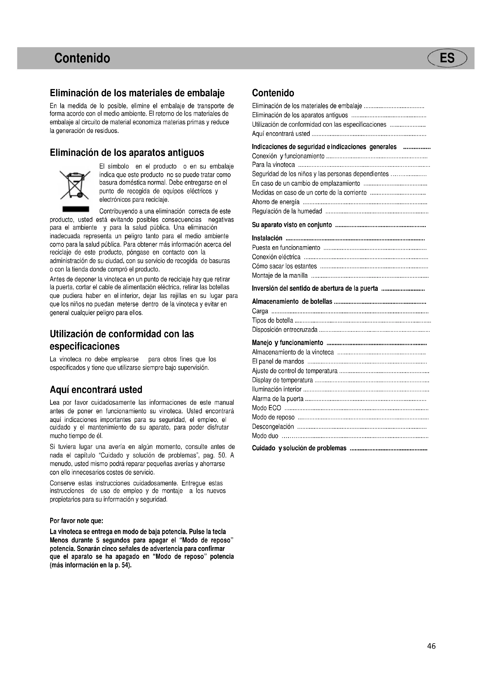 Eliminación de los materiales de embalaje En la medida de lo posible, elimine el embalaje de transporte de forma acorde con el medio ambiente. El retorno de los materiales de embalaje al circuito de material economiza materias primas y reduce la generación de residuos. Eliminación de los aparatos antiguos El símbolo en el producto o en su embalaje indica que este producto no se puede tratar como basura doméstica normal. Debe entregarse en el punto de recogida de equipos eléctricos y electrónicos para reciclaje. Contribuyendo a una eliminación correcta de este producto, usted está evitando posibles consecuencias negativas para el ambiente y para la salud pública. Una eliminación inadecuada representa un peligro tanto para el medio ambiente como para la salud pública. Para obtener más información acerca del reciclaje de este producto, póngase en contacto con la administración de su ciudad, con su servicio de recogida de basuras o con la tienda donde compró el producto. Antes de deponer la vinoteca en un punto de reciclaje hay que retirar la puerta, cortar el cable de alimentación eléctrica, retirar las botellas que pudiera haber en el interior, dejar las rejillas en su lugar para que los niños no puedan meterse dentro de la vinoteca y evitar en general cualquier peligro para ellos. Utilización de conformidad con las especificaciones La vinoteca no debe emplearse para otros fines que los especificados y tiene que utilizarse siempre bajo supervisión. Aquí encontrará usted Lea por favor cuidadosamente las informaciones de este manual antes de poner en funcionamiento su vinoteca. Usted encontrará aquí indicaciones importantes para su seguridad, el empleo, el cuidado y el mantenimiento de su aparato, para poder disfrutar mucho tiempo de él. Si tuviera lugar una avería en algún momento, consulte antes de nada el capítulo “Cuidado y solución de problemas”, pag. 50. A menudo, usted mismo podrá reparar pequeñas averías y ahorrarse con ello innecesarios costes de servicio. Conserve estas instrucciones cuidadosamente. Entregue estas instrucciones de uso de empleo y de montaje a los nuevos propietarios para su información y seguridad. Por favor note que: La vinoteca se entrega en modo de baja potencia. Pulse la tecla Menos durante 5 segundos para apagar el “Modo de reposo” potencia. Sonarán cinco señales de advertencia para confirmar que el aparato se ha apagado en “Modo de reposo” potencia (más información en la p. 54). Contenido Eliminación de los materiales de embalaje ..................................... Eliminación de los aparatos antiguos .............................................. Utilización de conformidad con las especificaciones ...................... Aquí encontrará usted ......................................................................