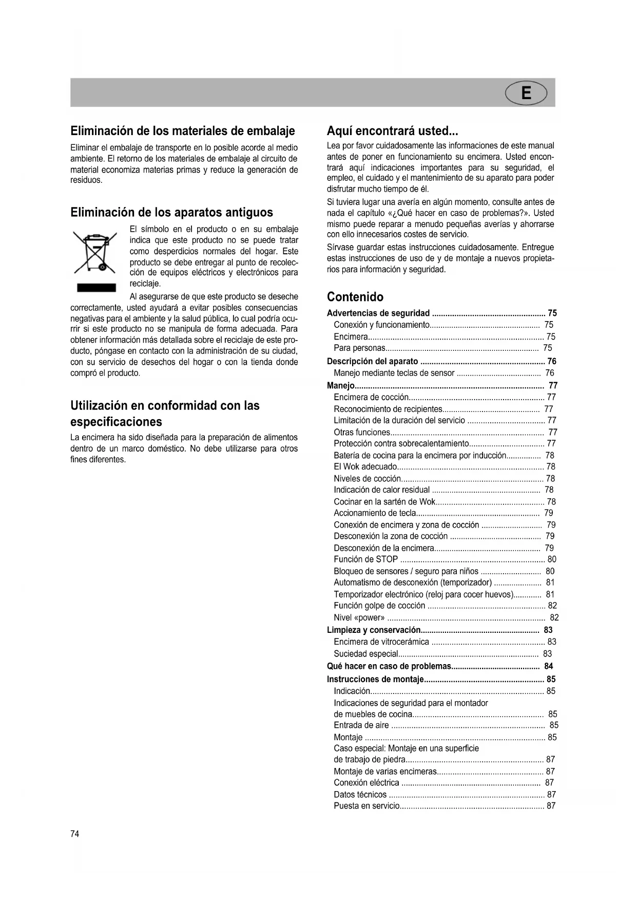 - Lea por favor cuidadosamente las informaciones de este manual antes de poner en funcionamiento su encimera. Usted encon- trará aquí indicaciones importantes para su seguridad, el empleo, el cuidado y el mantenimiento de su aparato para poder disfrutar mucho tiempo de él. Si tuviera lugar una avería en algún momento, consulte antes de nada el capítulo «¿Qué hacer en caso de problemas?». Usted mismo puede reparar a menudo pequeñas averías y ahorrarse con ello innecesarios costes de servicio. Sírvase guardar estas instrucciones cuidadosamente. Entregue estas instrucciones de uso de y de montaje a nuevos propieta- rios para información y seguridad. Contenido Advertencias de seguridad p. 75