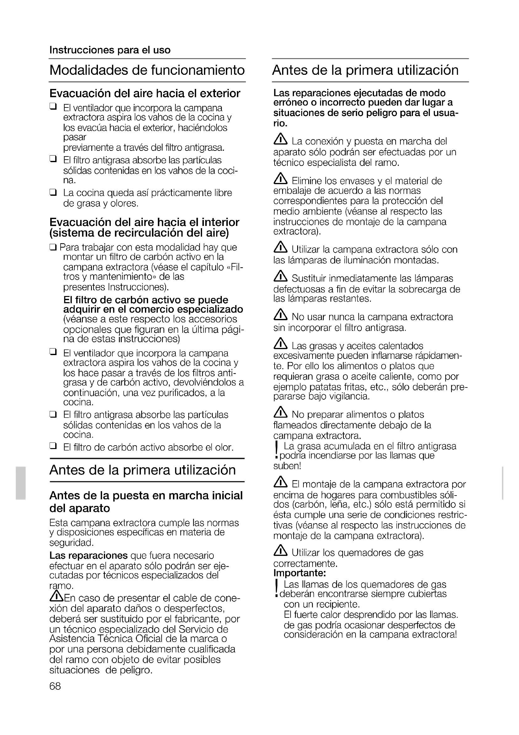 El ventilador que incorpora la campanaextractora aspira los vahos de la cocina ylos hace pasar a través de los filtros anti-grasa y de carbón activo, devolviéndolos acontinuación, una vez purificados, a lacocina. El filtro antigrasa absorbe las partículassólidas contenidas en los vahos de la cocina. El filtro de carbón activo absorbe el olor. Antes de la primera utilización Antes de la puesta en marcha inicial del aparato Esta campana extractora cumple las normasy disposiciones específicas en materia de seguridad.Las reparaciones que fuera necesario efectuar en el aparato sólo podrán ser eje-cutadas por técnicos especializados delramo. En caso de presentar el cable de cone- xión del aparato daños o desperfectos, deberá ser sustituido por el fabricante, por un técnico especializado del Servicio de Asistencia Técnica Oficial de la marca o por una persona debidamente cualificada del ramo con objeto de evitar posibles situaciones de peligro. Modalidades de funcionamiento Instrucciones para el uso Antes de la primera utilización69 La manera más eficaz de absorber los vahos producidos en la cocina durante la preparación de los alimentos es: