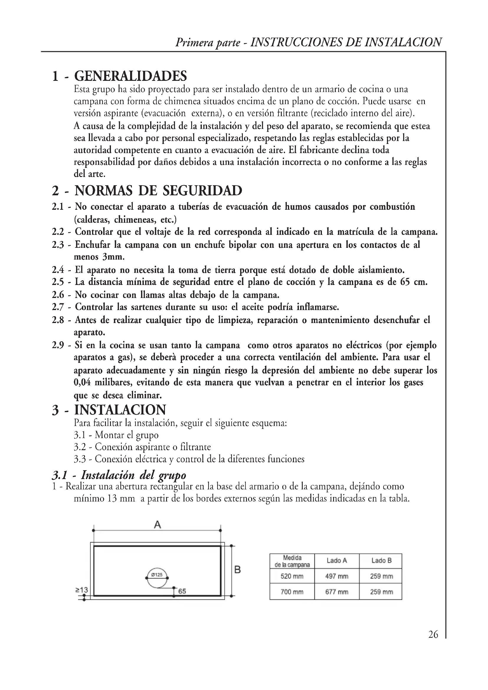 Esta grupo ha sido proyectado para ser instalado dentro de un armario de cocina o una campana con forma de chimenea situados encima de un plano de cocción. Puede usarse en versión aspirante (evacuación externa), o en versión filtrante (reciclado interno del aire). A causa de la complejidad de la instalación y del peso del aparato, se recomienda que estea sea llevada a cabo por personal especializado, respetando las reglas establecidas por la autoridad competente en cuanto a evacuación de aire. El fabricante declina toda responsabilidad por daños debidos a una instalación incorrecta o no conforme a las reglas del arte.