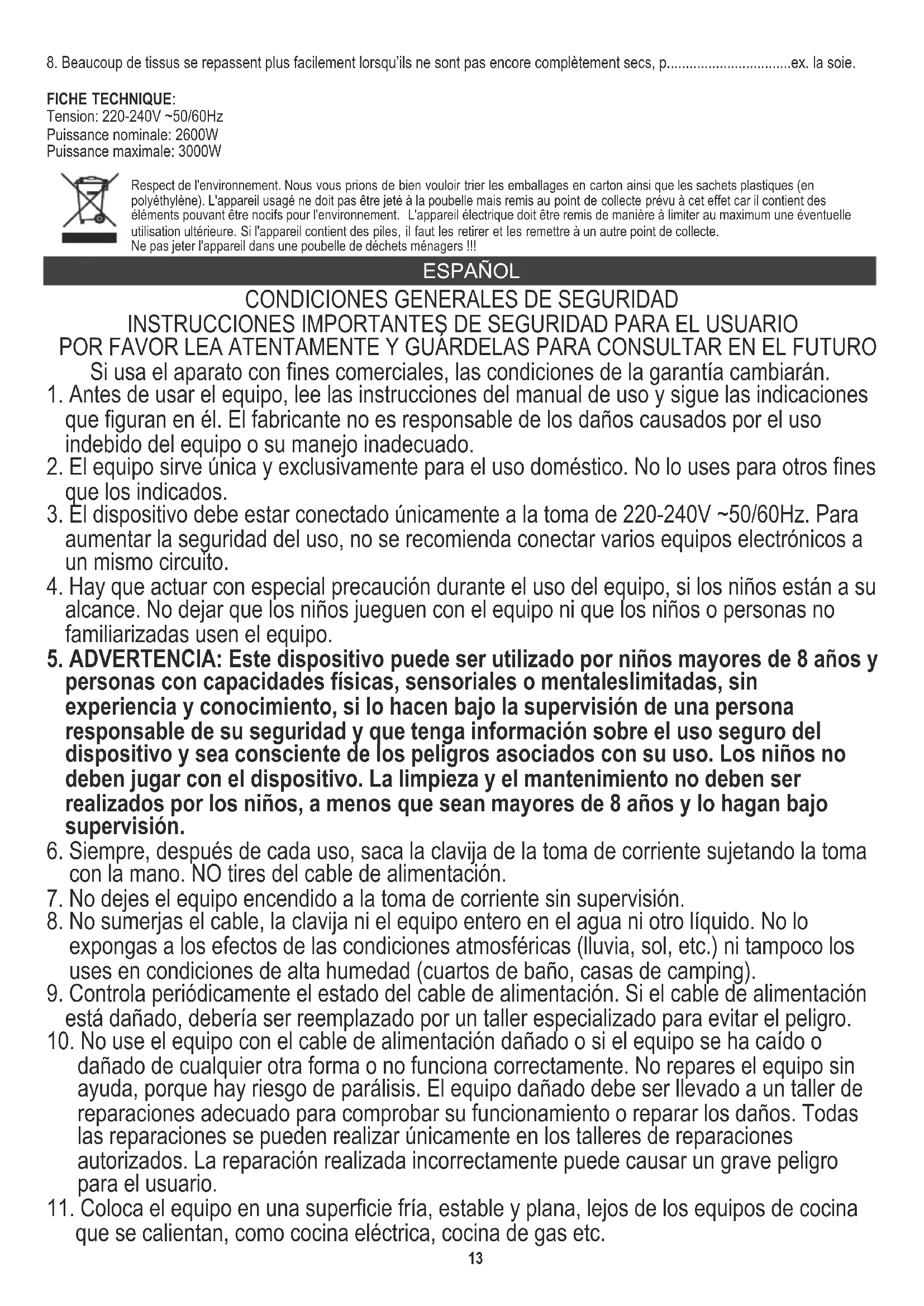 5. ADVERTENCIA: Este dispositivo puede ser utilizado por niños mayores de 8 años y