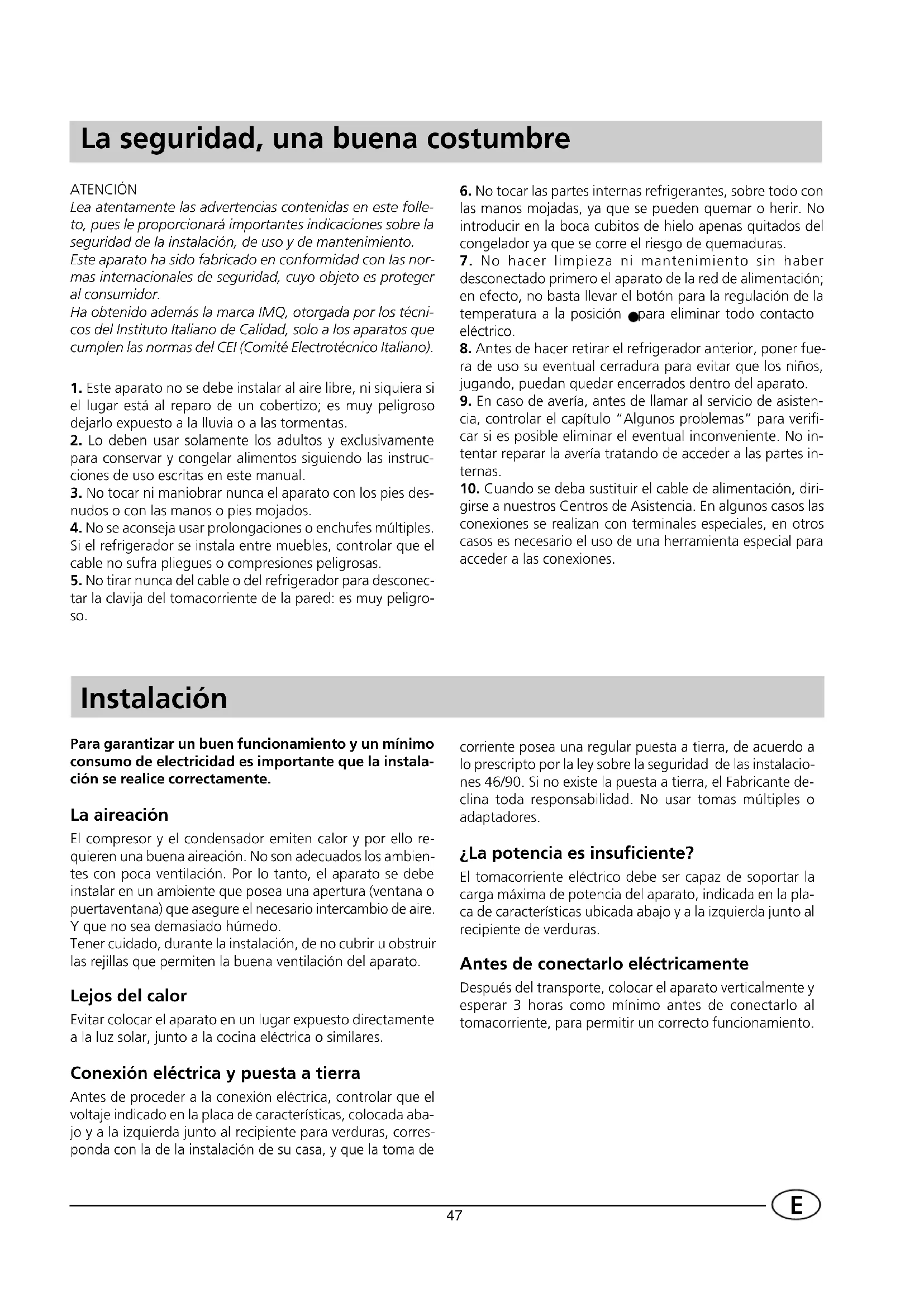 girse a nuestros Centros de Asistencia. En algunos casos las conexiones se realizan con terminales especiales, en otros casos es necesario el uso de una herramienta especial para acceder a las conexiones. Instalación Para garantizar un buen funcionamiento y un mínimo consumo de electricidad es importante que la instala- ción se realice correctamente. La aireación El compresor y el condensador emiten calor y por ello re- quieren una buena aireación. No son adecuados los ambien- tes con poca ventilación. Por lo tanto, el aparato se debe instalar en un ambiente que posea una apertura (ventana o puertaventana) que asegure el necesario intercambio de aire. Y que no sea demasiado húmedo. Tener cuidado, durante la instalación, de no cubrir u obstruir las rejillas que permiten la buena ventilación del aparato. Lejos del calor Evitar colocar el aparato en un lugar expuesto directamente a la luz solar, junto a la cocina eléctrica o similares. Conexión eléctrica y puesta a tierra Antes de proceder a la conexión eléctrica, controlar que el voltaje indicado en la placa de características, colocada aba- jo y a la izquierda junto al recipiente para verduras, corres- ponda con la de la instalación de su casa, y que la toma de corriente posea una regular puesta a tierra, de acuerdo a lo prescripto por la ley sobre la seguridad de las instalacio- nes 46/90. Si no existe la puesta a tierra, el Fabricante de- clina toda responsabilidad. No usar tomas múltiples o adaptadores. ¿La potencia es insuficiente? El tomacorriente eléctrico debe ser capaz de soportar la carga máxima de potencia del aparato, indicada en la pla- ca de características ubicada abajo y a la izquierda junto al recipiente de verduras. Antes de conectarlo eléctricamente Después del transporte, colocar el aparato verticalmente y esperar 3 horas como mínimo antes de conectarlo al tomacorriente, para permitir un correcto funcionamiento. ATENCIÓN Lea atentamente las advertencias contenidas en este folle- to, pues le proporcionará importantes indicaciones sobre la seguridad de la instalación, de uso y de mantenimiento. Este aparato ha sido fabricado en conformidad con las nor- mas internacionales de seguridad, cuyo objeto es proteger al consumidor. Ha obtenido además la marca IMQ, otorgada por los técni- cos del Instituto Italiano de Calidad, solo a los aparatos que cumplen las normas del CEI (Comité Electrotécnico Italiano).