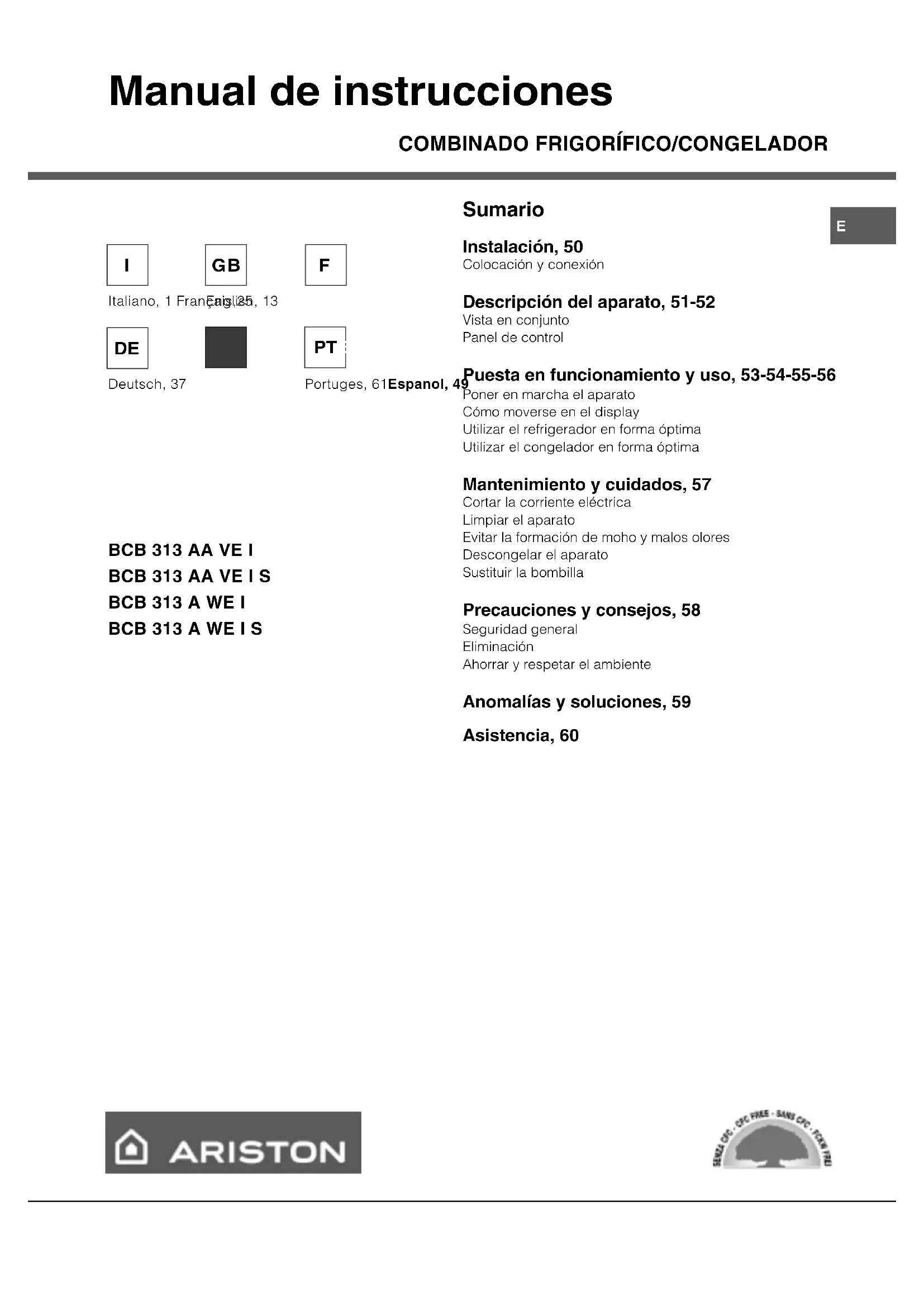 Portuges, 61Espanol, 49 PTE Sumario Instalación, 50 Colocación y conexión Descripción del aparato, 51-52 Vista en conjunto Panel de control Puesta en funcionamiento y uso, 53-54-55-56 Poner en marcha el aparato Cómo moverse en el display Utilizar el refrigerador en forma óptima Utilizar el congelador en forma óptima Mantenimiento y cuidados, 57 Cortar la corriente eléctrica Limpiar el aparato Evitar la formación de moho y malos olores Descongelar el aparato Sustituir la bombilla Precauciones y consejos, 58 Seguridad general Eliminación Ahorrar y respetar el ambiente Anomalías y soluciones, 59 Asistencia, 6050