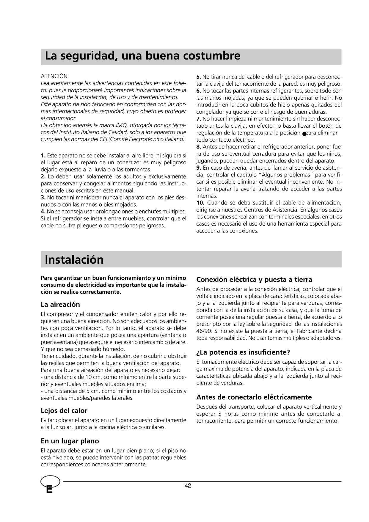 dirigirse a nuestros Centros de Asistencia. En algunos casos las conexiones se realizan con terminales especiales, en otros casos es necesario el uso de una herramienta especial para acceder a las conexiones. Instalación Para garantizar un buen funcionamiento y un mínimo consumo de electricidad es importante que la instala- ción se realice correctamente. La aireación El compresor y el condensador emiten calor y por ello re- quieren una buena aireación. No son adecuados los ambien- tes con poca ventilación. Por lo tanto, el aparato se debe instalar en un ambiente que posea una apertura (ventana o puertaventana) que asegure el necesario intercambio de aire. Y que no sea demasiado húmedo. Tener cuidado, durante la instalación, de no cubrir u obstruir las rejillas que permiten la buena ventilación del aparato. Para una buena aireación del aparato es necesario dejar: - una distancia de 10 cm. como mínimo entre la parte supe- rior y eventuales muebles situados encima; - una distancia de 5 cm. como mínimo entre los costados y eventuales muebles/paredes laterales. Lejos del calor Evitar colocar el aparato en un lugar expuesto directamente a la luz solar, junto a la cocina eléctrica o similares. En un lugar plano El aparato debe estar en un lugar bien plano; si el piso no está nivelado, se puede intervenir con las patitas regulables correspondientes colocadas anteriormente. Conexión eléctrica y puesta a tierra Antes de proceder a la conexión eléctrica, controlar que el voltaje indicado en la placa de características, colocada aba- jo y a la izquierda junto al recipiente para verduras, corres- ponda con la de la instalación de su casa, y que la toma de corriente posea una regular puesta a tierra, de acuerdo a lo prescripto por la ley sobre la seguridad de las instalaciones 46/90. Si no existe la puesta a tierra, el Fabricante declina toda responsabilidad. No usar tomas múltiples o adaptadores. ¿La potencia es insuficiente? El tomacorriente eléctrico debe ser capaz de soportar la car- ga máxima de potencia del aparato, indicada en la placa de características ubicada abajo y a la izquierda junto al reci- piente de verduras. Antes de conectarlo eléctricamente Después del transporte, colocar el aparato verticalmente y esperar 3 horas como mínimo antes de conectarlo al tomacorriente, para permitir un correcto funcionamiento. ATENCIÓN Lea atentamente las advertencias contenidas en este folle- to, pues le proporcionará importantes indicaciones sobre la seguridad de la instalación, de uso y de mantenimiento. Este aparato ha sido fabricado en conformidad con las nor- mas internacionales de seguridad, cuyo objeto es proteger al consumidor. Ha obtenido además la marca IMQ, otorgada por los técni- cos del Instituto Italiano de Calidad, solo a los aparatos que cumplen las normas del CEI (Comité Electrotécnico Italiano).
