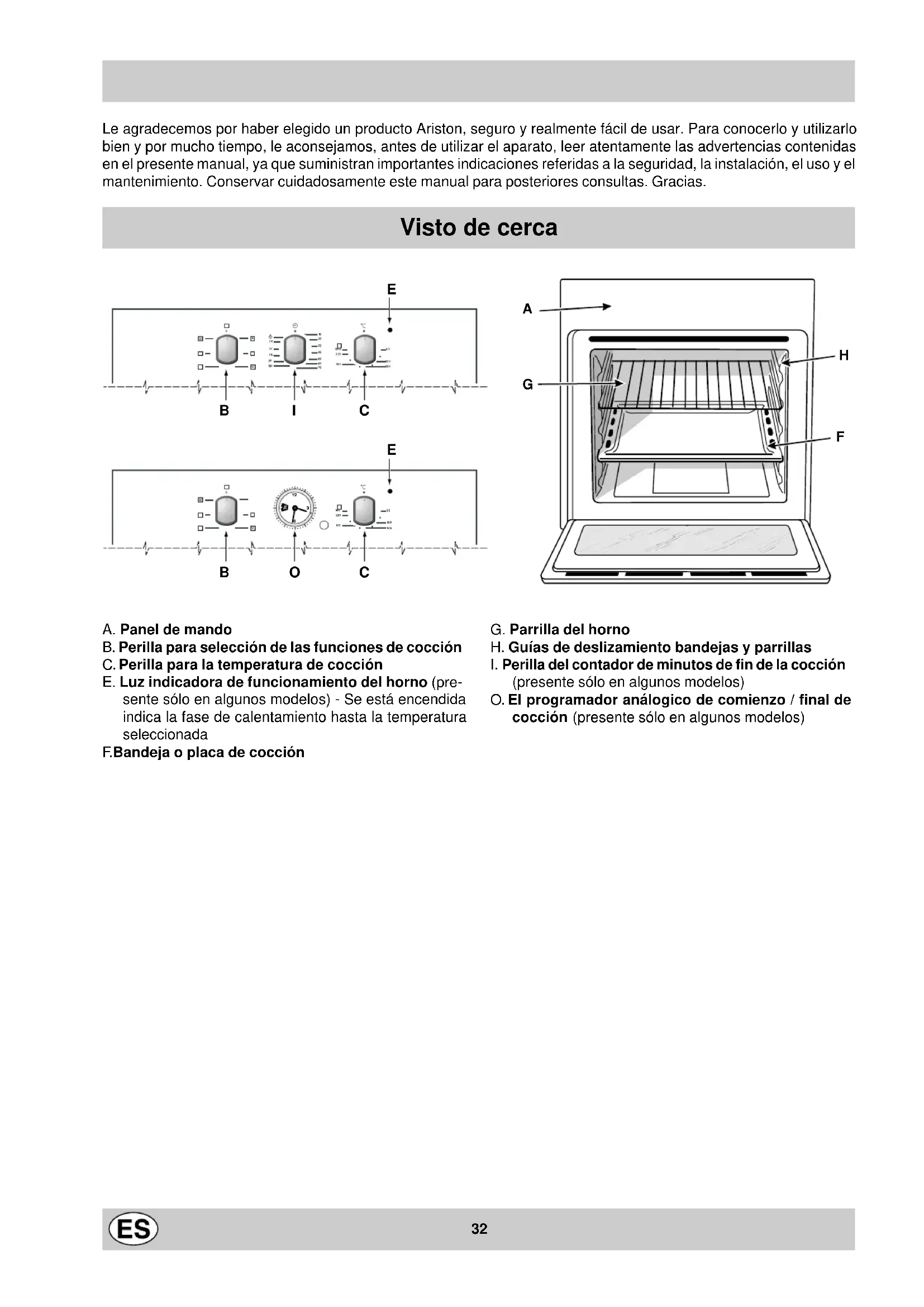 Cet appareil est conforme aux Directives Communautaires suivantes : - 73/23/CEE du 19/02/73 (Basse Tension) et modifications successives ; - 89/336/CEE du 03/05/89 (Compatibilité électromagnétique) et modifications successives ; - 93/68/CEE du 22/07/93 et modifications successives.32 Le agradecemos por haber elegido un producto Ariston, seguro y realmente fácil de usar. Para conocerlo y utilizarlo bien y por mucho tiempo, le aconsejamos, antes de utilizar el aparato, leer atentamente las advertencias contenidas en el presente manual, ya que suministran importantes indicaciones referidas a la seguridad, la instalación, el uso y el mantenimiento. Conservar cuidadosamente este manual para posteriores consultas. Gracias. Visto de cerca A. Panel de mando B. Perilla para selección de las funciones de cocción C. Perilla para la temperatura de cocción E. Luz indicadora de funcionamiento del horno (pre- sente sólo en algunos modelos) - Se está encendida indica la fase de calentamiento hasta la temperatura seleccionada F. Bandeja o placa de cocción G. Parrilla del horno H. Guías de deslizamiento bandejas y parrillas