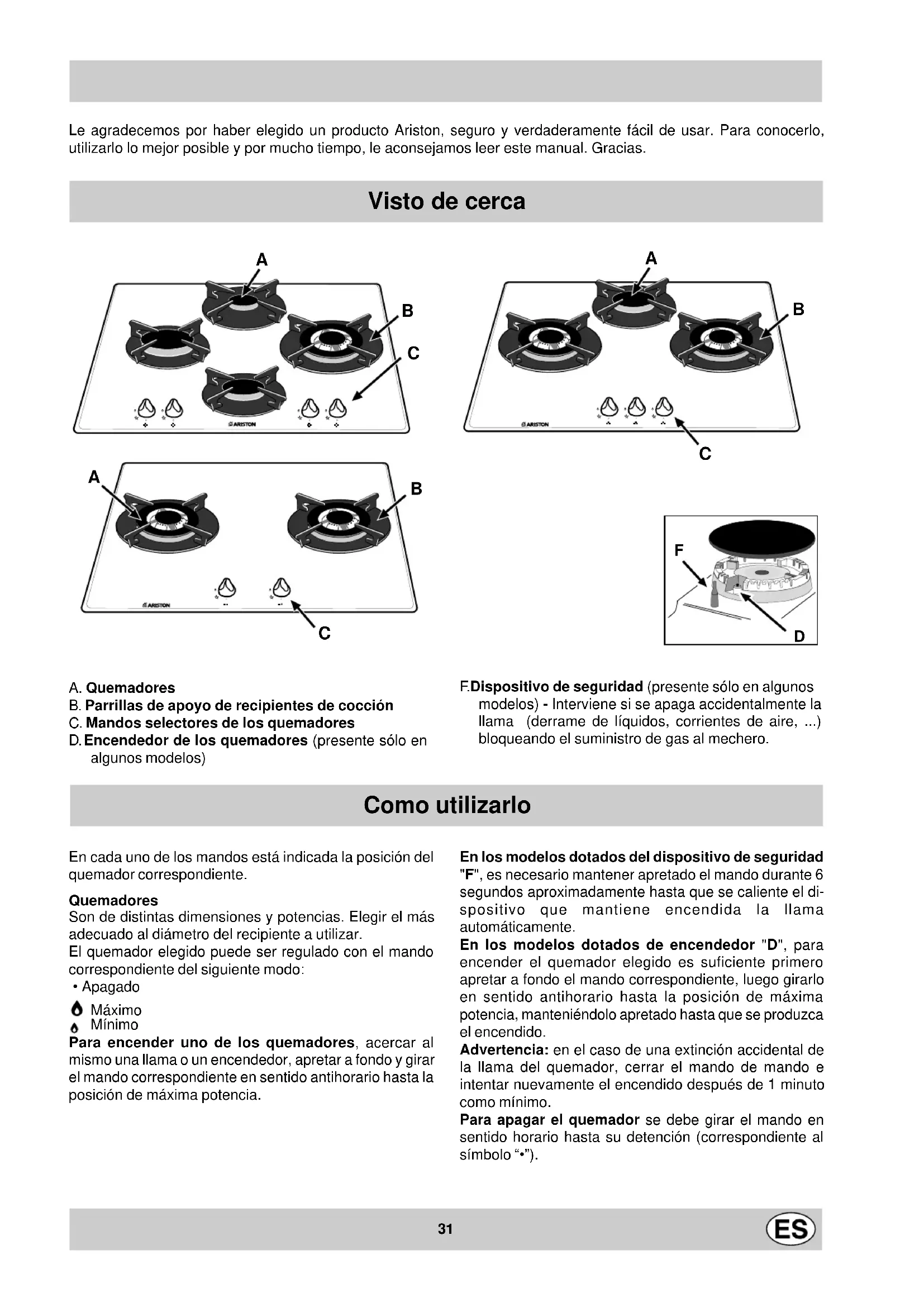 TD 740...31 Le agradecemos por haber elegido un producto Ariston, seguro y verdaderamente fácil de usar. Para conocerlo, utilizarlo lo mejor posible y por mucho tiempo, le aconsejamos leer este manual. Gracias. A. Quemadores B. Parrillas de apoyo de recipientes de cocción C. Mandos selectores de los quemadores D. Encendedor de los quemadores (presente sólo en algunos modelos) Como utilizarlo En cada uno de los mandos está indicada la posición del quemador correspondiente. Quemadores Son de distintas dimensiones y potencias. Elegir el más adecuado al diámetro del recipiente a utilizar. El quemador elegido puede ser regulado con el mando correspondiente del siguiente modo: