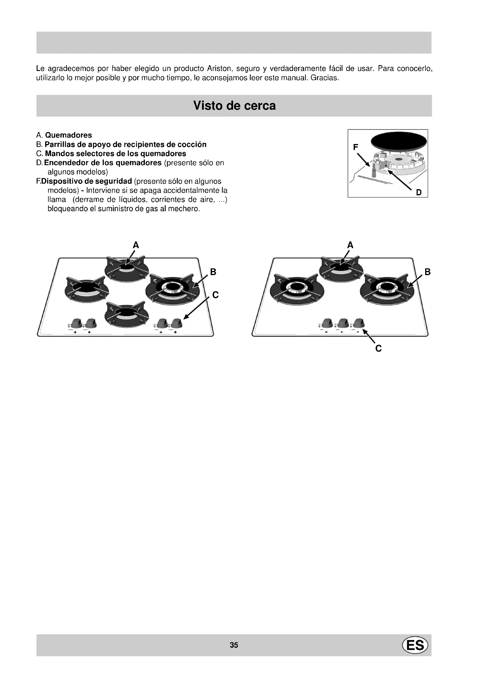 Estos aparatos han sido construidos de conformidad con las siguientes Normas Comunitarias: - 73/23/CEE del 19/02/73 (Baja Tensión) y sucesivas modificaciones; - 89/336/CEE del 03/05/89 (Compatibilidad Electromagnética) y sucesivas modificaciones; - 90/396/CEE del 29/06/90 (Gas) y sucesivas modificaciones; - 93/68/CEE del 22/07/93 y sucesivas modificaciones. - 2002/96/CE En base a la Norma europea 2002/96/CE de Residuos de aparatos Eléctricos y Electrónicos (RAEE), los electrodomésticos viejos no pueden ser arrojados en los contenedores municipales habituales; tienen que ser recogidos selectivamente para optimizar la recuperación y reciclado de los componentes y materiales que los constituyen, y reducir el impacto en la salud humana y el medioambiente. El símbolo del cubo de basura tachado se marca sobre todos los productos para recordar al consumidor la obligación de separarlos para la recogida selectiva. El consumidor debe contactar con la autoridad local o con el vendedor para informarse en relación a la correcta eleminación de su electrodoméstico viejo.43 Agradecemos a sua escolha de um produto Ariston, seguro e realmente fácil de utilizar. Para conhecê-lo e utilizá-lo da melhor maneira e mais tempo, aconselhamos que leia este manual. Obrigado. Visto de perto A. Queimadores de gás. B. Grelhas de apoio para recipientes para cozedura. C. Manípulos de comando dos queimadores de gás. D. Dispositivo para acender os queimadores de gás (existente somente em alguns modelos). F. Dispositivo de segurança (existente somente em alguns modelos) - Intervém caso a chama apagar-se acidentalmente (líquidos derramados, correntes de ar etc.) bloqueando a alimentação de gás ao queimador.