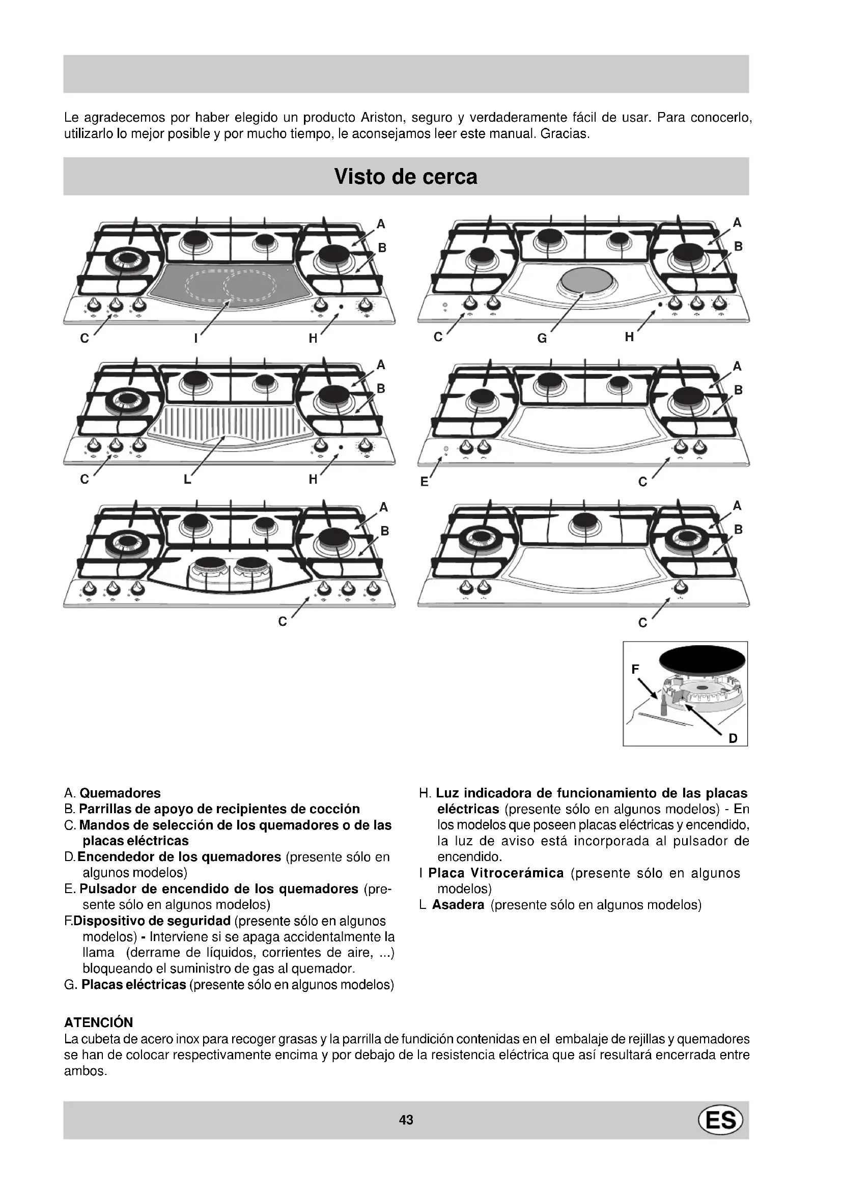 - Apagado Máximo Mínimo Para encender uno de los quemadores, acercar al mismo una llama o un encendedor, apretar a fondo y gi- rar el mando correspondiente en sentido antihorario hasta la posición de máxima potencia. En los modelos dotados del dispositivo de seguridad "F", es necesario mantener apretado el mando durante 6 segundos aproximadamente hasta que se caliente el dispositivo que mantiene encendida la llama automáticamente. En los modelos dotados de encendedor "D", para encender el quemador elegido, apretar primero el pulsador de encendido “E”, identificado con el símbolo , luego apretar a fondo y girar el mando correspondiente en sentido antihorario hasta la posición de máxima potencia. Algunos modelos están dotados de encendido integrado dentro del mando, en este caso existe el encendedor “D” pero no el pulsador “E” (el símbolo se encuentra cerca de cada mando). Para encender el quemador elegido es suficiente primero apretar a fondo el mando correspondiente, luego girarlo en sentido antihorario hasta la posición de máxima potencia, manteniéndolo apretado hasta que se produzca el encendido. Advertencia: en el caso de una extinción accidental de la llama del quemador, cerrar el mando e intentar nuevamente el encendido después de 1 minuto como mínimo. Para apagar el quemador se debe girar el mando en sentido horario hasta su detención (correspondiente al símbolo “•”). Placas eléctricas (presentes sólo en algunos modelos) Pueden ser de diámetros y potencias diversas: "normales" o "rápidas", estas últimas se distinguen de las otras por la presencia de un círculo rojo en el centro. La regulación se puede realizar girando el mando correspondiente en sentido horario o antihorario en 6 posiciones distintas: 0 Apagado 1 Potencia mínima 2÷5 Potencias intermedias 6 Potencia máxima En el capítulo "Consejos prácticos para el uso" se indica la relación entre las posiciones indicadas en los mandos y el uso para el cual las placas son aconsejadas. Para cualquier posición del mando, diferente de la de apagado, se produce el encendido de la luz indicadora de funcionamiento "H". Asadera (presentes sólo en algunos modelos) La regulación se puede realizar girando el mando correspondiente en sentido horario o antihorario en 12 posiciones distintas: 0 Apagado 1 Potencia mínima 2÷11 Potencias intermedias 12 Potencia máxima Para cualquier posición del mando, diferente de la de apagado, se produce el encendido de la luz indicadora de funcionamiento "H". Vitrocerámica (presentes sólo en algunos modelos) Esta zona de cocción dispone de calentadores radiantes de doble diámetro, situados debajo del cristal. Se puede encender la zona circular "A" únicamente o, si se desea mayor espacio, ambas zonas "A" y "B". Para activar la zona circular "A" bastará mover el mando en sentido horario, coincidiendo con una de las 12 posiciones de regulación disponibles. Para activar la zona "B" llegar hasta la posición 12 y efectuar un clic hasta la posición , seguidamente se procederá a su regulación moviendo el mando en sentido antihorario, hasta alcanzar uno de los 12 niveles posible. La ilustración del Manual indica la zona de calor que se pone roja al momento de activarla. A. Zona de cocción circular B. Zona de cocción extensible C. Piloto indicador de calor residual: indica que la zona tiene temperatura superior a 60°C, que permanece después de apagado el elemento.