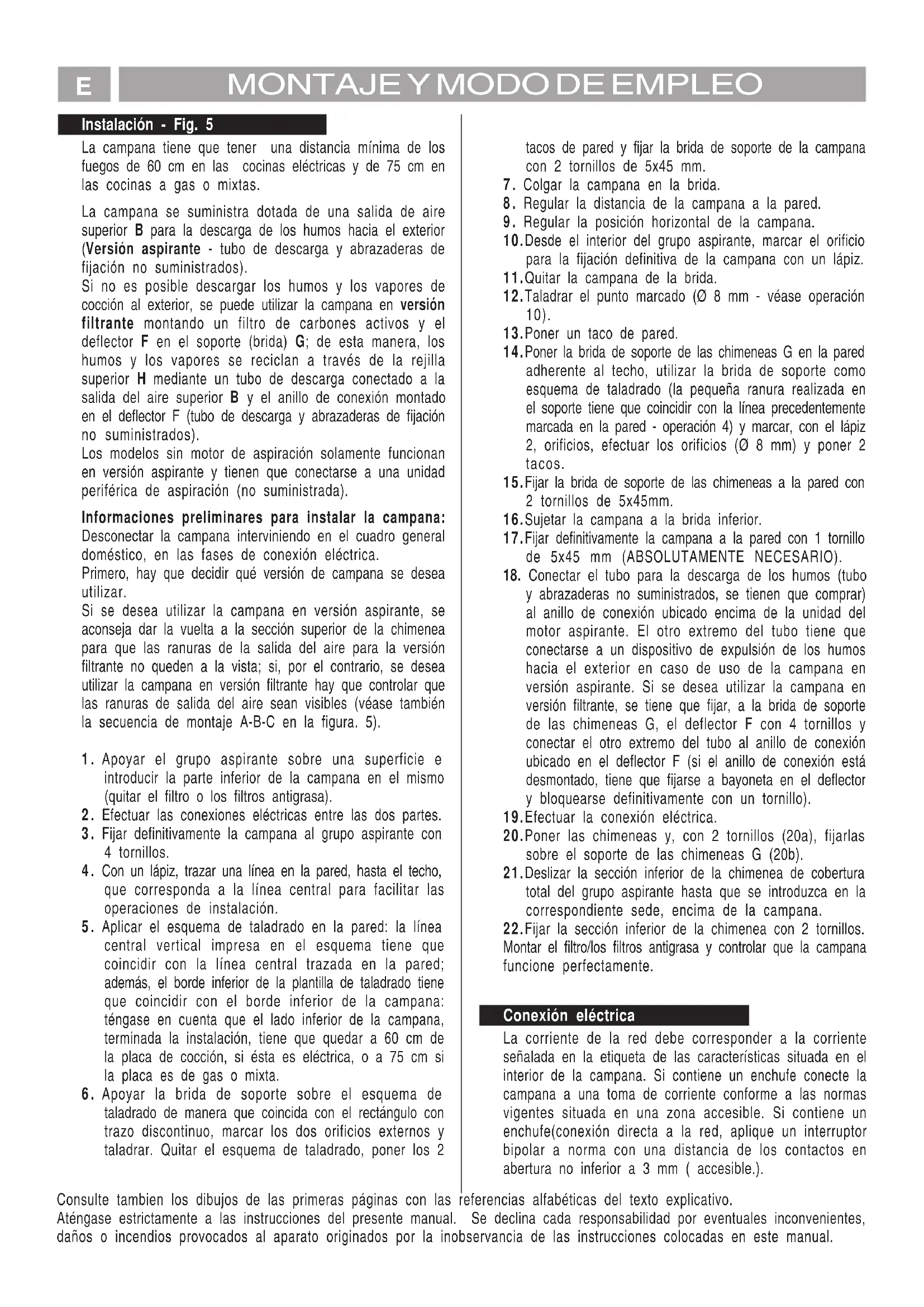 IInstalación - Fig. 5 La campana tiene que tener una distancia mínima de los fuegos de 60 cm en las cocinas eléctricas y de 75 cm en las cocinas a gas o mixtas. La campana se suministra dotada de una salida de aire superior B para la descarga de los humos hacia el exterior (Versión aspirante - tubo de descarga y abrazaderas de fijación no suministrados). Si no es posible descargar los humos y los vapores de cocción al exterior, se puede utilizar la campana en versión filtrante montando un filtro de carbones activos y el deflector F en el soporte (brida) G; de esta manera, los humos y los vapores se reciclan a través de la rejilla superior H mediante un tubo de descarga conectado a la salida del aire superior B y el anillo de conexión montado en el deflector F (tubo de descarga y abrazaderas de fijación no suministrados). Los modelos sin motor de aspiración solamente funcionan en versión aspirante y tienen que conectarse a una unidad periférica de aspiración (no suministrada). Informaciones preliminares para instalar la campana: Desconectar la campana interviniendo en el cuadro general doméstico, en las fases de conexión eléctrica. Primero, hay que decidir qué versión de campana se desea utilizar. Si se desea utilizar la campana en versión aspirante, se aconseja dar la vuelta a la sección superior de la chimenea para que las ranuras de la salida del aire para la versión filtrante no queden a la vista; si, por el contrario, se desea utilizar la campana en versión filtrante hay que controlar que las ranuras de salida del aire sean visibles (véase también la secuencia de montaje A-B-C en la figura. 5).