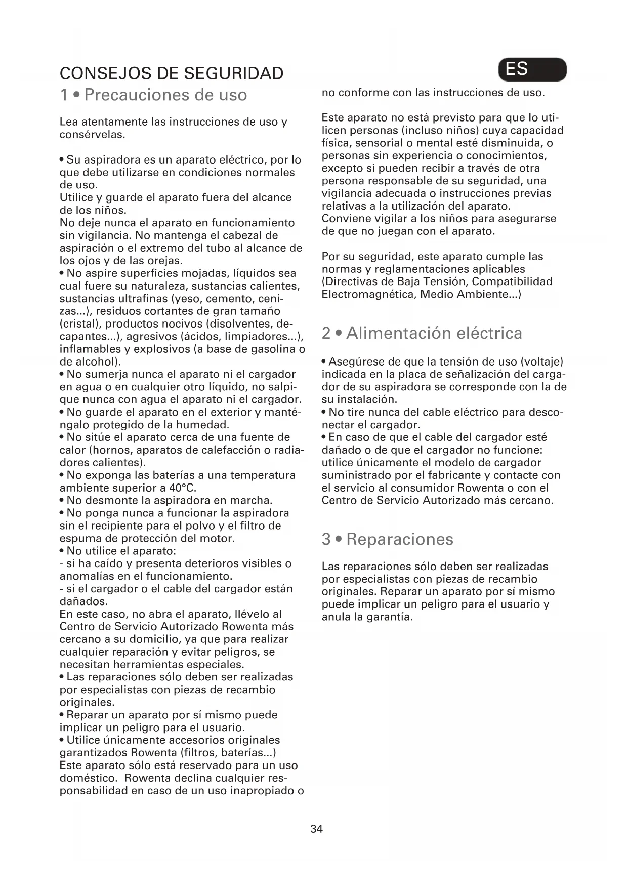 - En caso de que el cable del cargador esté dañado o de que el cargador no funcione: utilice únicamente el modelo de cargador suministrado por el fabricante y contacte con el servicio al consumidor Rowenta o con el Centro de Servicio Autorizado más cercano. 3 • Reparaciones Las reparaciones sólo deben ser realizadas por especialistas con piezas de recambio originales. Reparar un aparato por sí mismo puede implicar un peligro para el usuario y anula la garantía.