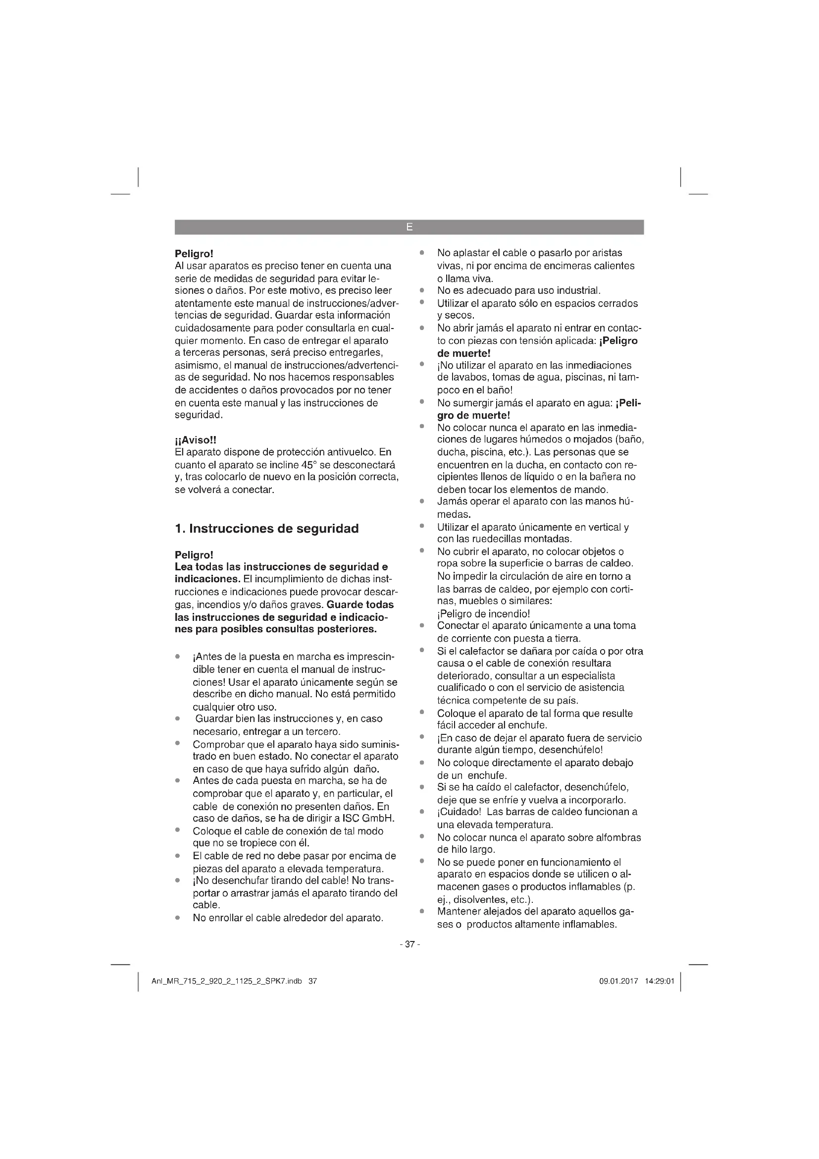 Peligro! Al usar aparatos es preciso tener en cuenta una serie de medidas de seguridad para evitar le- siones o daños. Por este motivo, es preciso leer atentamente este manual de instrucciones/adver- tencias de seguridad. Guardar esta información cuidadosamente para poder consultarla en cual- quier momento. En caso de entregar el aparato a terceras personas, será preciso entregarles, asimismo, el manual de instrucciones/advertenci- as de seguridad. No nos hacemos responsables de accidentes o daños provocados por no tener en cuenta este manual y las instrucciones de seguridad. ¡¡Aviso!! El aparato dispone de protección antivuelco. En cuanto el aparato se incline 45° se desconectará y, tras colocarlo de nuevo en la posición correcta, se volverá a conectar.