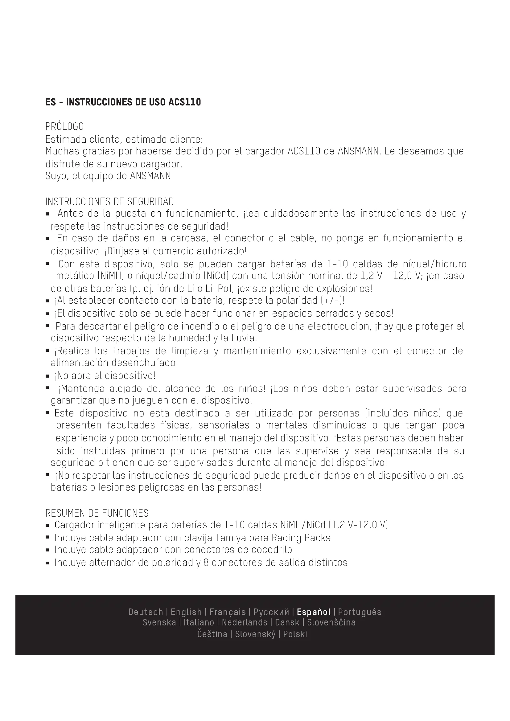 PRÓLOGO Estimada clienta, estimado cliente: Muchas gracias por haberse decidido por el cargador ACS110 de ANSMANN. Le deseamos que disfrute de su nuevo cargador. Suyo, el equipo de ANSMANN