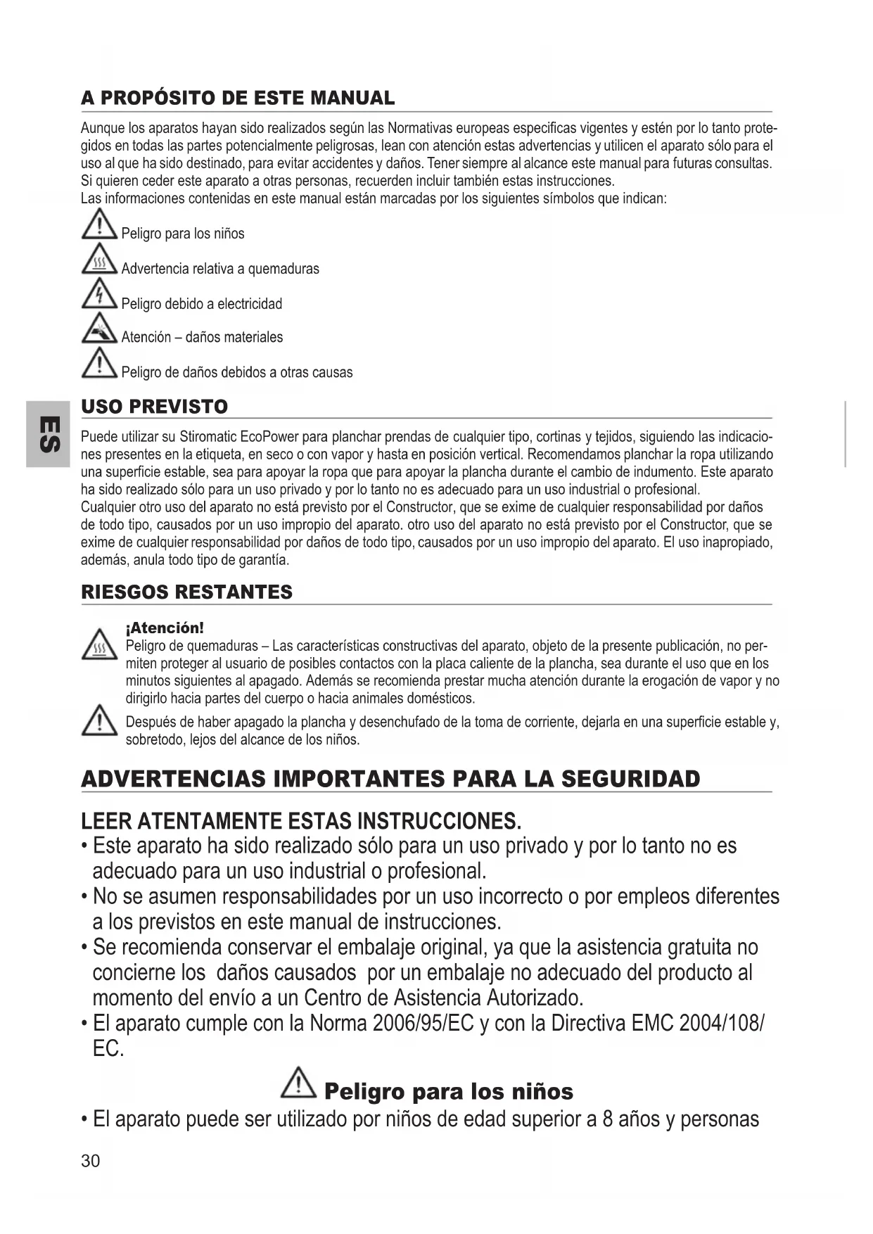 Aunque los aparatos hayan sido realizados según las Normativas europeas especicas vigentes y estén por lo tanto prote- gidos en todas las partes potencialmente peligrosas, lean con atención estas advertencias y utilicen el aparato sólo para el uso al que ha sido destinado, para evitar accidentes y daños. Tener siempre al alcance este manual para futuras consultas. Si quieren ceder este aparato a otras personas, recuerden incluir también estas instrucciones. Las informaciones contenidas en este manual están marcadas por los siguientes símbolos que indican: Peligro para los niños Advertencia relativa a quemaduras Peligro debido a electricidad Atención – daños materiales Peligro de daños debidos a otras causas USO PREVISTO Puede utilizar su Stiromatic EcoPower para planchar prendas de cualquier tipo, cortinas y tejidos, siguiendo las indicacio- nes presentes en la etiqueta, en seco o con vapor y hasta en posición vertical. Recomendamos planchar la ropa utilizando una supercie estable, sea para apoyar la ropa que para apoyar la plancha durante el cambio de indumento. Este aparato ha sido realizado sólo para un uso privado y por lo tanto no es adecuado para un uso industrial o profesional. Cualquier otro uso del aparato no está previsto por el Constructor, que se exime de cualquier responsabilidad por daños de todo tipo, causados por un uso impropio del aparato. otro uso del aparato no está previsto por el Constructor, que se exime de cualquier responsabilidad por daños de todo tipo, causados por un uso impropio del aparato. El uso inapropiado, además, anula todo tipo de garantía. RIESGOS RESTANTES ¡Atención! Peligro de quemaduras – Las características constructivas del aparato, objeto de la presente publicación, no per- miten proteger al usuario de posibles contactos con la placa caliente de la plancha, sea durante el uso que en los minutos siguientes al apagado. Además se recomienda prestar mucha atención durante la erogación de vapor y no dirigirlo hacia partes del cuerpo o hacia animales domésticos. Después de haber apagado la plancha y desenchufado de la toma de corriente, dejarla en una supercie estable y, sobretodo, lejos del alcance de los niños.