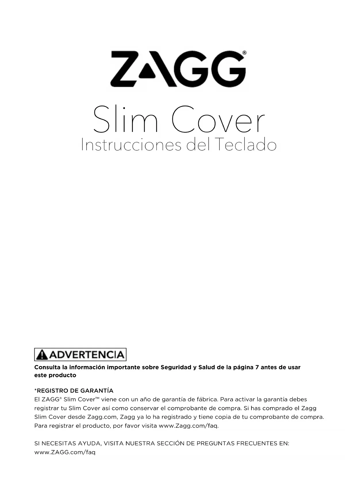 El ZAGG® Slim Cover™ viene con un año de garantía de fábrica. Para activar la garantía debes registrar tu Slim Cover así como conservar el comprobante de compra. Si has comprado el Zagg Slim Cover desde Zagg.com, Zagg ya lo ha registrado y tiene copia de tu comprobante de compra. Para registrar el producto, por favor visita www.Zagg.com/faq. SI NECESITAS AYUDA, VISITA NUESTRA SECCIÓN DE PREGUNTAS FRECUENTES EN: www.ZAGG.com/faq Consulta la información importante sobre Seguridad y Salud de la página 7 antes de usar este productoINTRODUCCIÓN Enhorabuena por la compra del Zagg Slim Cover, el mejor teclado y funda de tablet para Microsoft Surface™ Pro 3 y 4. Tu nuevo Zagg Slim Cover funciona perfectamente con Surface Pro 3 y 4 para darte más funcionalidad, una forma de escribir más fácil y protección añadida. Lee estas instrucciones íntegramente y guárdalas en lugar seguro para futuras consultas. Ahora prepárate para disfrutar de una escritura portátil tan versátil como tú.