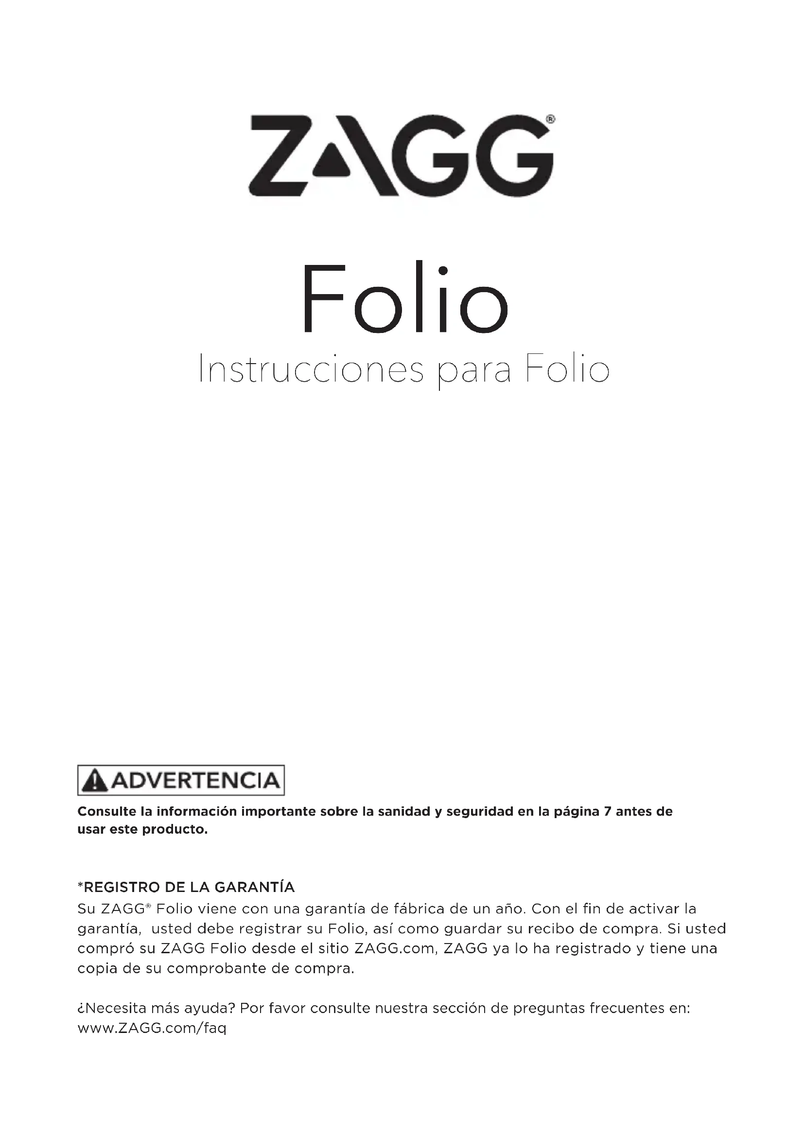 Su ZAGG® Folio viene con una garantía de fábrica de un año. Con el fin de activar la garantía, usted debe registrar su Folio, así como guardar su recibo de compra. Si usted compró su ZAGG Folio desde el sitio ZAGG.com, ZAGG ya lo ha registrado y tiene una copia de su comprobante de compra. ¿Necesita más ayuda? Por favor consulte nuestra sección de preguntas frecuentes en: www.ZAGG.com/faq Consulte la información importante sobre la sanidad y seguridad en la página 7 antes de usar este producto.INSERTAR/EXTRAER SU iPad® Para insertar su iPad en el Folio, comience colocando el teclado del Folio frente a usted. Luego, con su iPad en modo horizontal y los botones de control de volumen mirando hacia afuera (el botón Inicio está a su derecha) ajuste la mitad inferior de su iPad en la cubierta, asegurándose de que esté bien ajustado (puede que tenga que aplicar una ligera presión a su iPad para asegurarse que esté ajustado en la parte inferior de la cubierta). A continuación, presione para colocar la mitad superior dentro de la cubierta. Revise todas las esquinas para asegurarse que también se hayan colocado correctamente. Cuando su iPad está asegurado en el Folio, usted puede cerrarlo y los imanes hábilmente colocados activarán la función de hibernación/ reactivación de su iPad para ayudar a preservar la vida de la batería. Basta con abrir el Folio reactivar a su iPad. Para quitar fácilmente su iPad, tome la parte superior de la cubierta del Folio en el centro y aplique una ligera presión en la parte posterior de su iPad. Tome su iPad por el lado expuesto y levante/arranque del Folio.