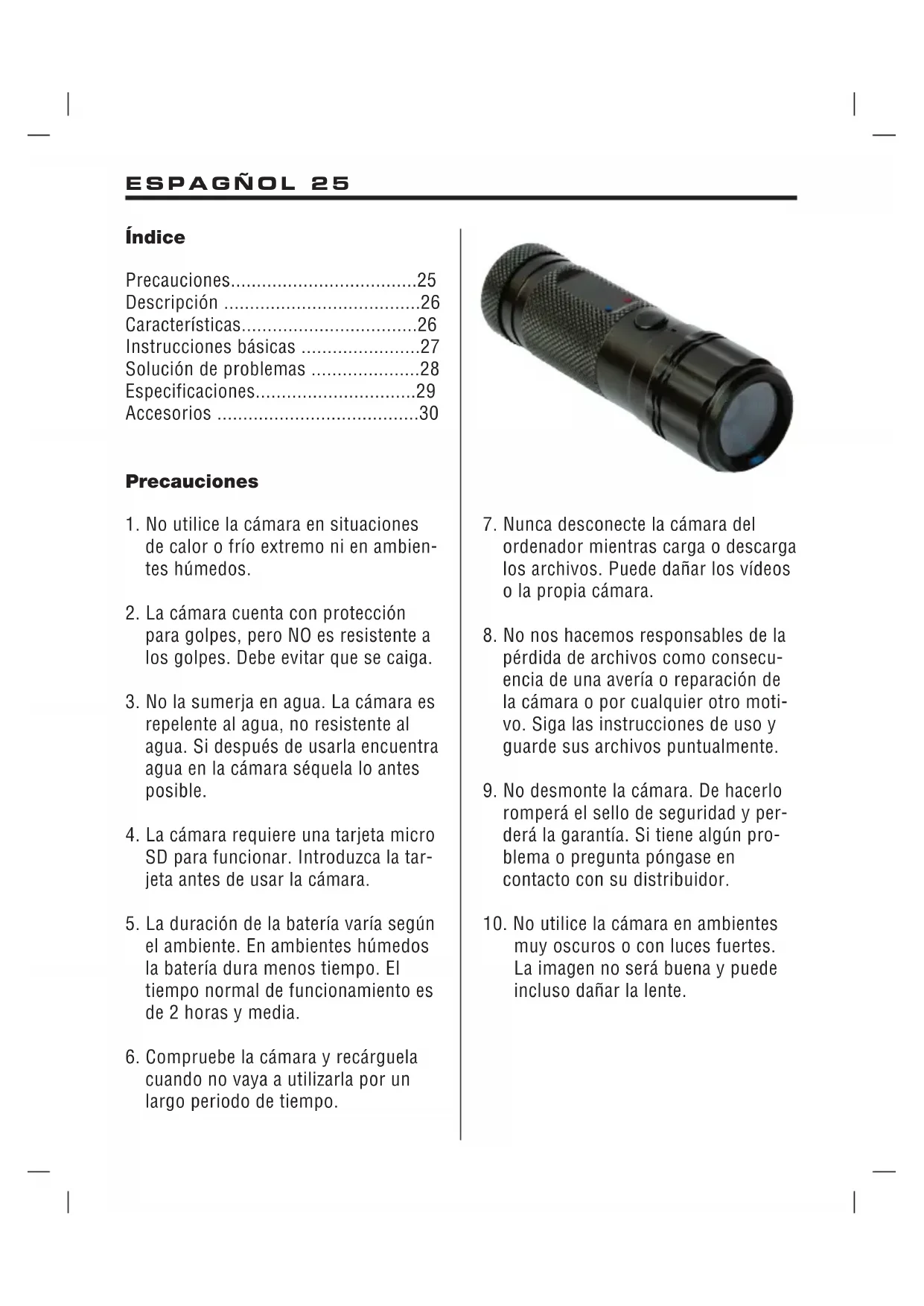 P3: ¿Cómo sé cuando la tarjeta está llena? R3: Si la función de grabación cíclica está desactivada el indicador azul par- padeará rápidamente cuando la tarjeta esté llena. La cámara se apagará enton- ces automáticamente. Si la función de grabación cíclica está activada no se mostrará ninguna señal ya que volverá a sobrescribir desde el comienzo. ESPAGÑOL 28P4: ¿Cómo sé que se está acabando la batería? R4: El indicador rojo parpadeará rápida- mente y la cámara se apagará entonces automáticamente. P5: No hay ningún archivo en la tarjeta después de la grabación. ¿Qué debo hacer? R5: Formatee la tarjeta o cámbiela. Intente grabar de nuevo. Siga las instrucciones paso a paso. P6: ¿Por qué no se ve bien el vídeo? R6: Compruebe que la lente está limpia y asegúrese de que no se producen fuertes sacudidas durante la grabación. P7: Al reproducir el vídeo en el ordenador la imagen y el sonido no coinciden. ¿Por qué? R7: Pruebe a reproducir el vídeo con otro programa como p. ej. VLC Media Player o Storm Player. Especificaciones Sensor de imagen: CMOS Ángulo abarcador: 120 grados Definición de la grabación: 1280 x 720 Velocidad de la grabación: 30 FPS Formato del vídeo: AVI Tamaño del archivo de vídeo: 75MB/minuto Duración de la grabación: 20 minutos Interfaz USB: USB 2.0 Memoria: Memoria flash no integrada, tarjeta micro SD asistida de hasta 32GB Duración de la batería: 2 horas y 30 minutos Tiempo de carga de la batería: 3 horas Color: Negro Medidas: 9,5 x 2,8 x 2,8 cm Peso: 64 gramos Impresión de tiempo: Opcional Grabación cíclica: Opcional