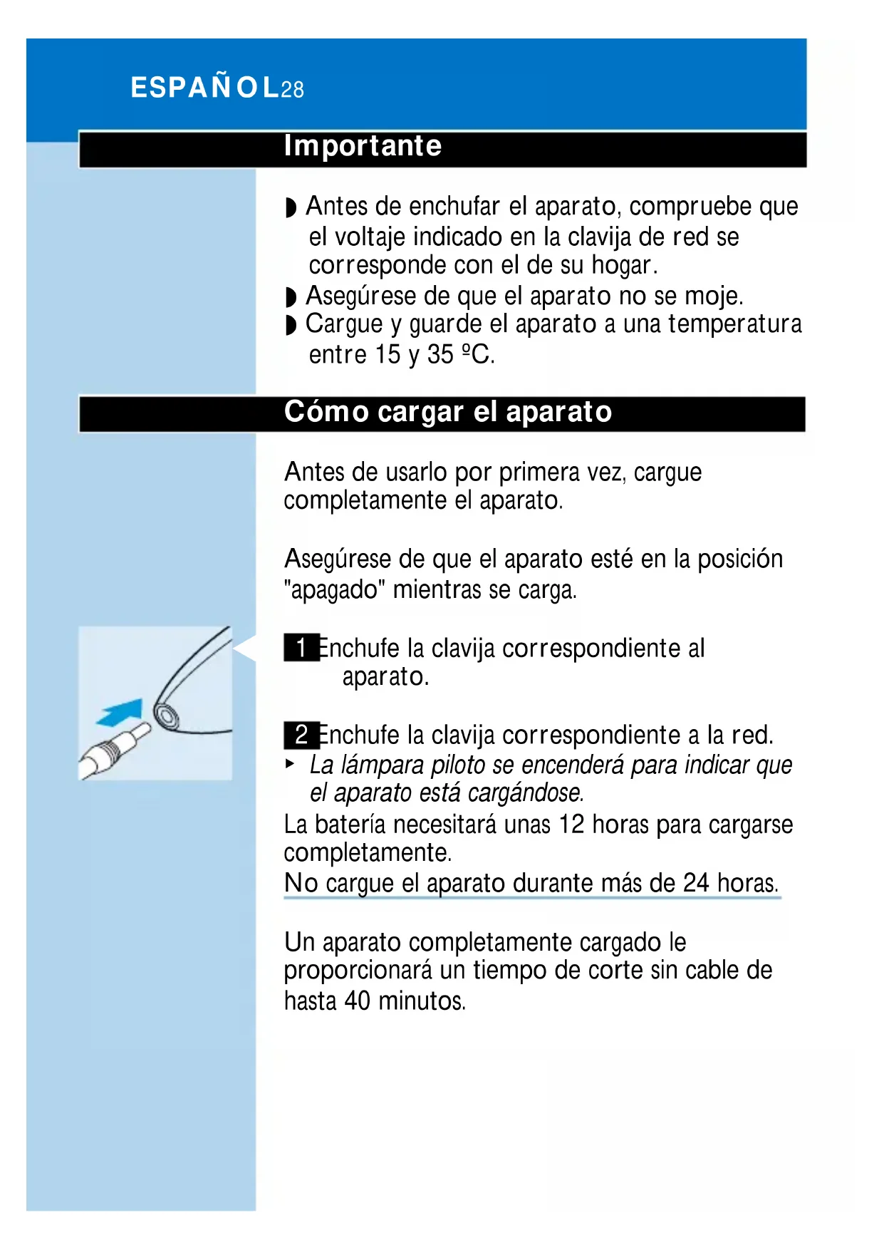 La lámpara piloto se encenderá para indicar que el aparato está cargándose. La batería necesitará unas 12 horas para cargarse completamente. No cargue el aparato durante más de 24 horas. Un aparato completamente cargado le proporcionará un tiempo de corte sin cable de hasta 40 minutos. ESPAÑOL28Corte con el aparato enchufado a la red. ◗ Para utilizar el cortapelo enchufado a la red : Ponga el cortapelo en la posición "apagado", enchúfelo a la red y espere unos segundos antes de ponerlo en marcha. Si la batería está completamente descargada, espere unos minutos antes de poner el aparato en marcha. No utilice el aparato enchufado a la red cuando la batería esté completamente cargada. Preparación para el corte de pelo ◗ Vea también el folleto "Modelling and styling". Corte con el accesorio-peine 1 Elija el accesorio adecuado (peine pequeño o peine grande) dependiendo de la longitud de pelo deseada (ver tabla).
