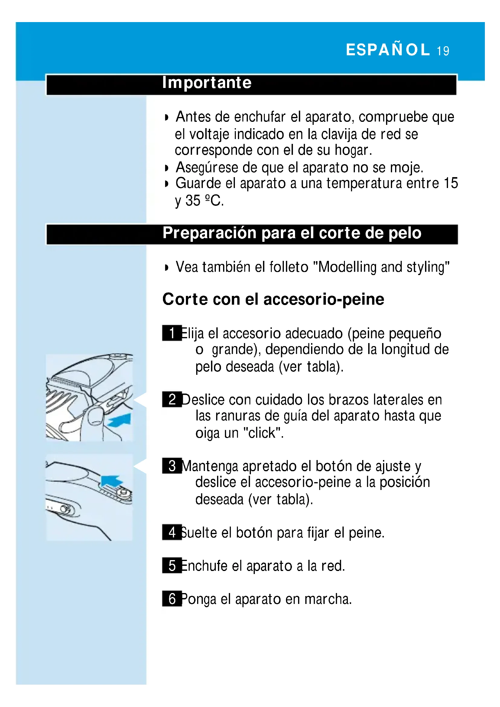 3 Mantenga apretado el botón de ajuste y deslice el accesorio-peine a la posición deseada (ver tabla). 4 Suelte el botón para fijar el peine. 5 Enchufe el aparato a la red. 6 Ponga el aparato en marcha. ESPAÑOL 19Si se ha acumulado mucho pelo en el peine, quite el accesorio-peine y elimine el pelo soplando o sacudiéndolo. Posiciones de longitud de corte Peine pequeño Peine grande Posición Longitud Posición Longitud del pelo del cabello 1 4 mm 8 24 mm 2 7 mm 9 27 mm 3 10 mm 10 30 mm 4 13 mm 11 33 mm 5 16 mm 12 35 mm 6 19 mm 13 38 mm 7 21 mm 14 40 mm Corte sin el accesorio-peine