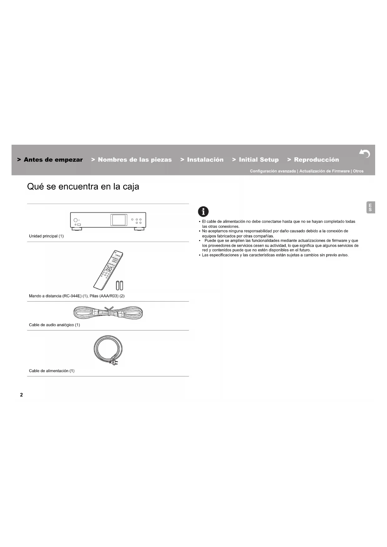 Qué se encuentra en la caja Antes de empezar 0 El cable de alimentación no debe conectarse hasta que no se hayan completado todas las otras conexiones. 0 No aceptamos ninguna responsabilidad por daño causado debido a la conexión de equipos fabricados por otras compañías. 0 Puede que se amplíen las funcionalidades mediante actualizaciones de firmware y que los proveedores de servicios cesen su actividad, lo que significa que algunos servicios de red y contenidos puede que no estén disponibles en el futuro. 0 Las especificaciones y las características están sujetas a cambios sin previo aviso. Unidad principal (1) Mando a distancia (RC-944E) (1), Pilas (AAA/R03) (2) Cable de audio analógico (1) Cable de alimentación (1)> Antes de empezar > Nombres de las piezas > Instalación > Initial Setup > Reproducción Configuración avanzada | Actualización de Firmware | Otros