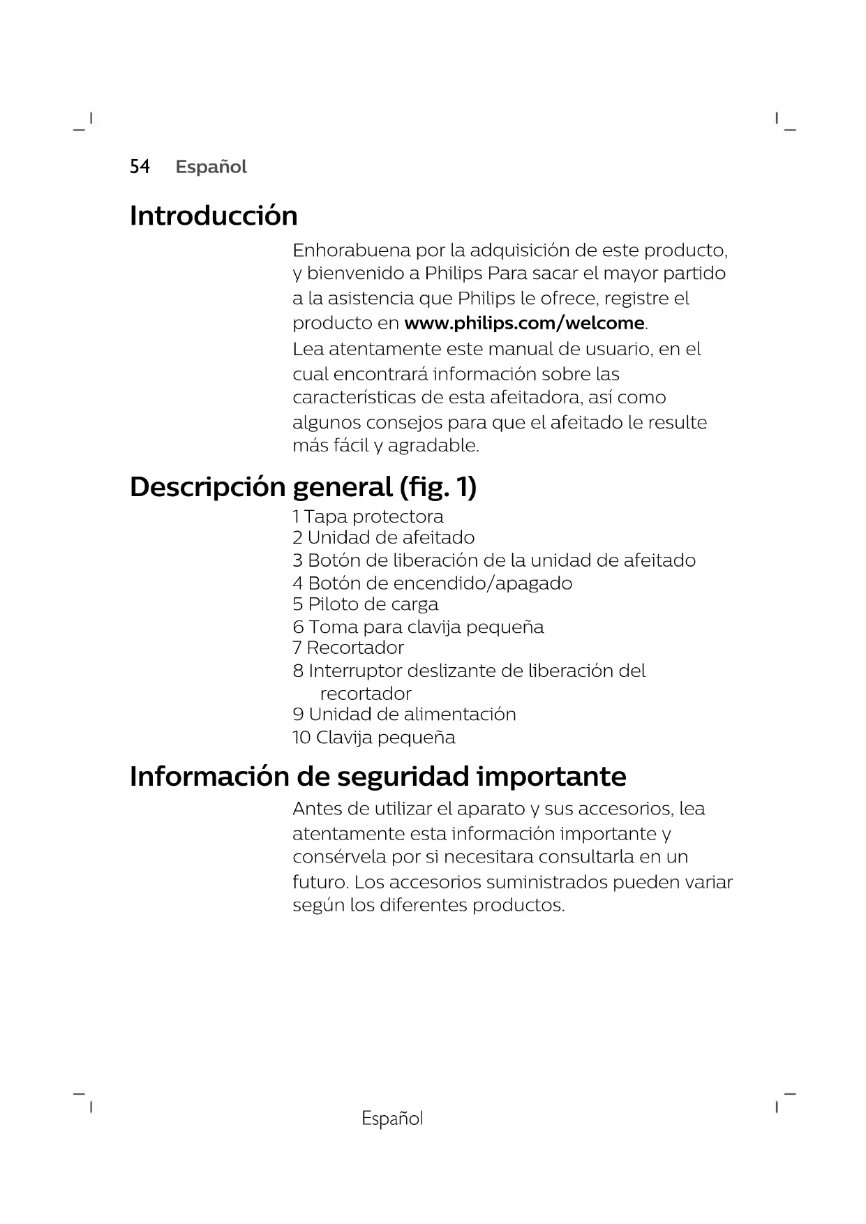 DeutschEspañol Introducción Enhorabuena por la adquisición de este producto, y bienvenido a Philips Para sacar el mayor partido a la asistencia que Philips le ofrece, registre el producto en www.philips.com/welcome. Lea atentamente este manual de usuario, en el cual encontrará información sobre las características de esta afeitadora, así como algunos consejos para que el afeitado le resulte más fácil y agradable. Descripción general (fig. 1) 1 Tapa protectora 2 Unidad de afeitado 3 Botón de liberación de la unidad de afeitado 4 Botón de encendido/apagado 5 Piloto de carga 6 Toma para clavija pequeña 7 Recortador 8 Interruptor deslizante de liberación del recortador 9 Unidad de alimentación 10 Clavija pequeña Información de seguridad importante Antes de utilizar el aparato y sus accesorios, lea atentamente esta información importante y consérvela por si necesitara consultarla en un futuro. Los accesorios suministrados pueden variar según los diferentes productos.