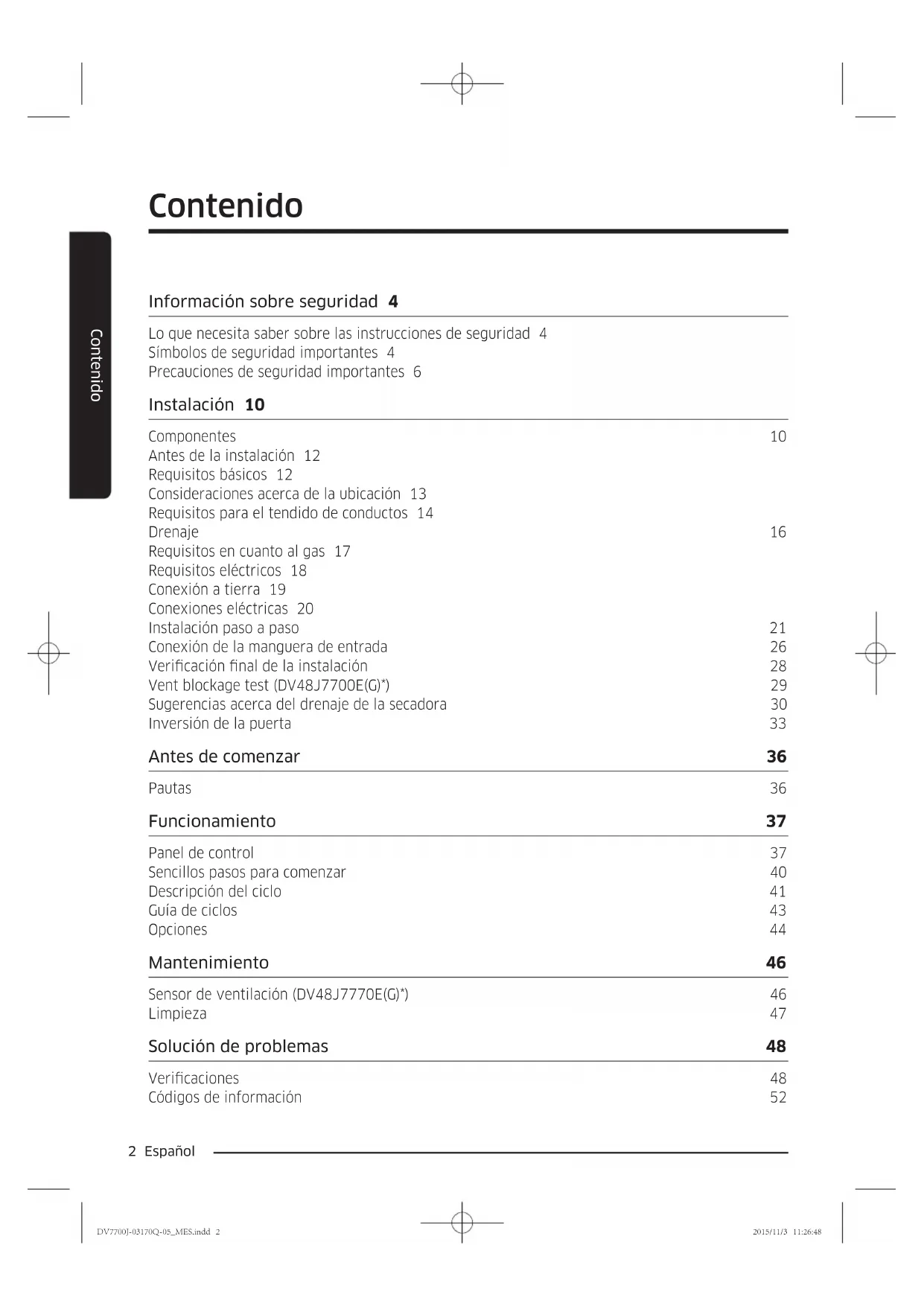 Contenido Información sobre seguridad 4 Lo que necesita saber sobre las instrucciones de seguridad 4 Símbolos de seguridad importantes 4 Precauciones de seguridad importantes 6 Instalación 10 Componentes 10 Antes de la instalación 12 Requisitos básicos 12 Consideraciones acerca de la ubicación 13 Requisitos para el tendido de conductos 14 Drenaje 16 Requisitos en cuanto al gas 17 Requisitos eléctricos 18 Conexión a tierra 19 Conexiones eléctricas 20 Instalación paso a paso 21 Conexión de la manguera de entrada 26 Vericación nal de la instalación 28 Vent blockage test (DV48J7700E(G)*) 29 Sugerencias acerca del drenaje de la secadora 30 Inversión de la puerta 33 Antes de comenzar 36 Pautas 36 Funcionamiento 37 Panel de control 37 Sencillos pasos para comenzar 40 Descripción del ciclo 41 Guía de ciclos 43 Opciones 44 Mantenimiento 46 Sensor de ventilación (DV48J7770E(G)*) 46 Limpieza 47 Solución de problemas 48 Vericaciones 48 Códigos de información 52 DV7700J-03170Q-05_MES.indd 2 2015/11/3 11:26:48Español 3 Contenido