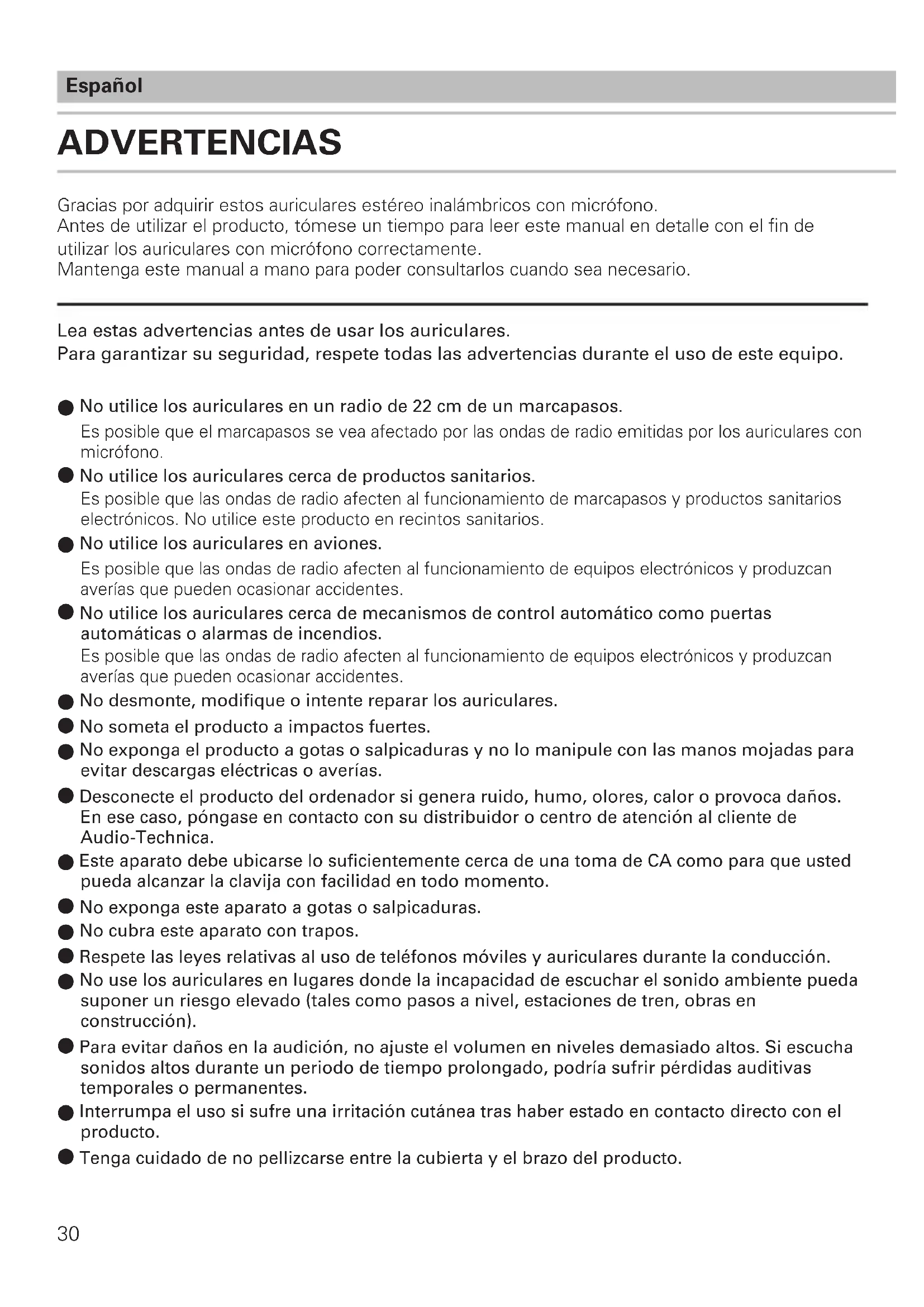 - La marque et les logos Bluetooth sont la propriété de Bluetooth SIG, Inc. et toute utilisation desdites marques par Audio-Technica Corporation est sous licence. Toutes les autres marques sont la propriété de leurs détenteurs respectifs. 29ADVERTENCIAS Español Lea estas advertencias antes de usar los auriculares. Para garantizar su seguridad, respete todas las advertencias durante el uso de este equipo. Gracias por adquirir estos auriculares estéreo inalámbricos con micrófono. Antes de utilizar el producto, tómese un tiempo para leer este manual en detalle con el n de utilizar los auriculares con micrófono correctamente. Mantenga este manual a mano para poder consultarlos cuando sea necesario.