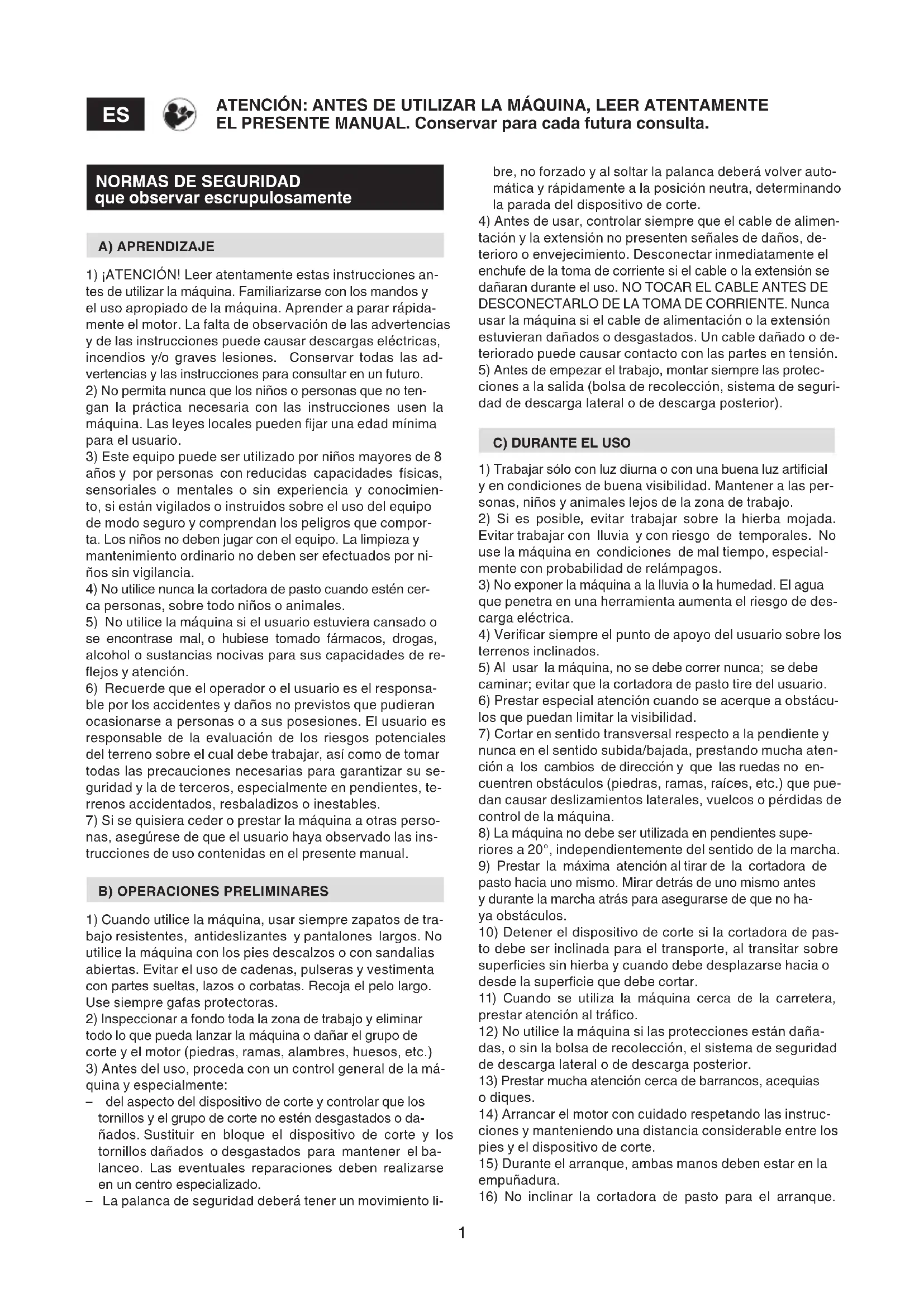 ATENCIÓN: ANTES DE UTILIZAR LA MÁQUINA, LEER ATENTAMENTE EL PRESENTE MANUAL. Conservar para cada futura consulta. bre, no forzado y al soltar la palanca deberá volver auto- mática y rápidamente a la posición neutra, determinando la parada del dispositivo de corte.