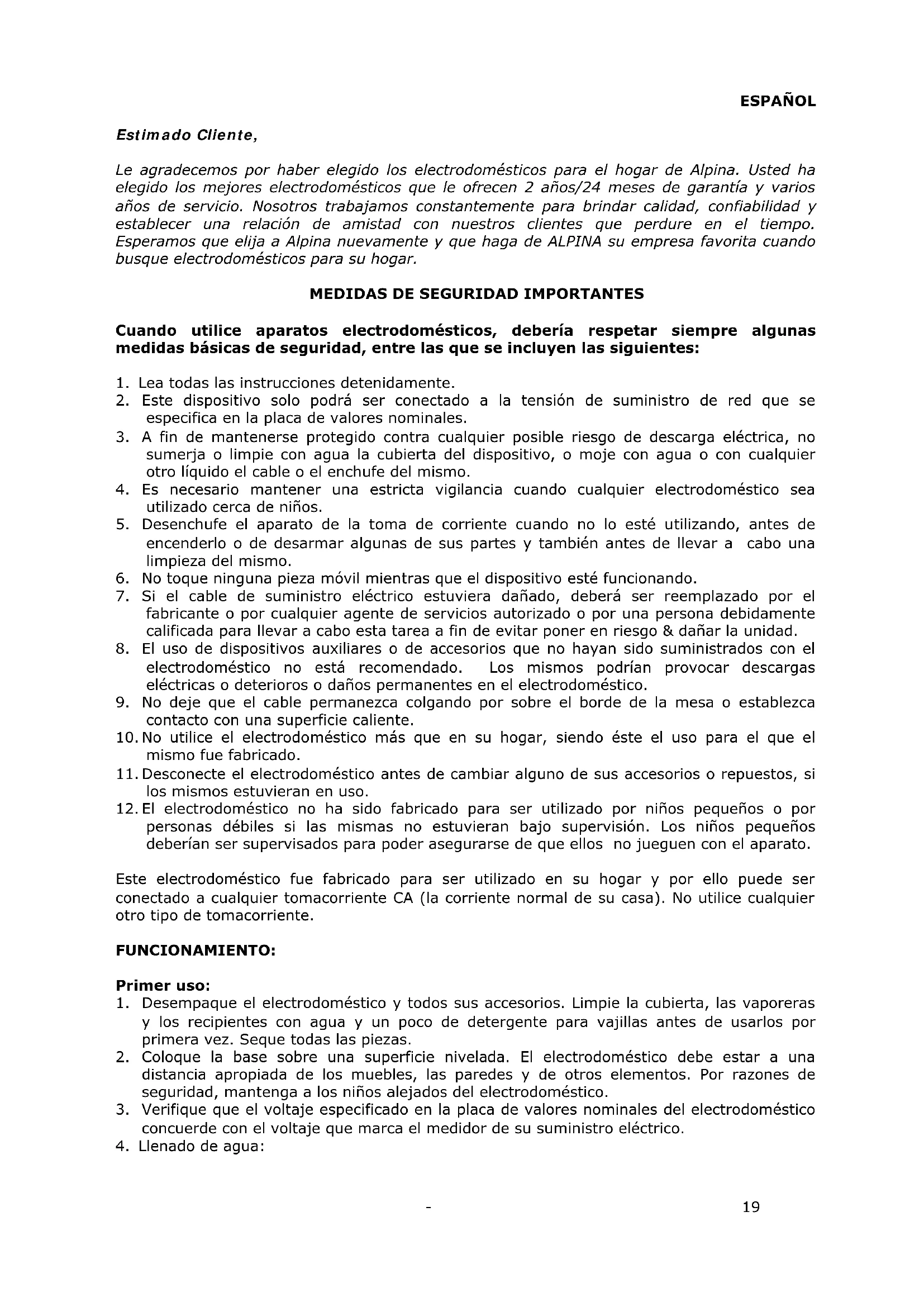 Estimado Cliente, Le agradecemos por haber elegido los electrodomésticos para el hogar de Alpina. Usted ha elegido los mejores electrodomésticos que le ofrecen 2 años/24 meses de garantía y varios años de servicio. Nosotros trabajamos constantemente para brindar calidad, confiabilidad y establecer una relación de amistad con nuestros clientes que perdure en el tiempo. Esperamos que elija a Alpina nuevamente y que haga de ALPINA su empresa favorita cuando busque electrodomésticos para su hogar.